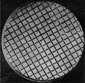 The correspondence was shown to Leo Scanlon, who passed it to Dr. Lee Devol, at the Mellon Institute of Industrial Research, who is interested in glass. He 11 commented as follows: "Glass does many strange things which we have not yet learned how to explain. I do not believe any of us can say exactly what took place; in the transfer to the glass. We do know that glass is readily attacked by different chemicals. Even pure water can be guilty of the attack. There was moisture in the lap, together with a large number of compounds whose action it would be impossible to predict. The remaining surface -may be more resistant to polishing because it is more resistant to chemical attack by the water in the rouge, or it may be that the chemical nature of the glass surface is such that it is less inclined to attach itself to rouge than it would have been before exposure to the lap. In this case there should be, for the portion of the glass which has been covered by the lap, a lower coefficient of friction in polishing." Well, so what? This: We have hypotheses but no final answer. Can anyone else provide the definitive one in this odd puzzle? ONION SACK or any kind of coarse-mesh netting may be used for cold-pressing sub-facets, or facetettes, into the ordinary facets of a pitch lap (Figure 1). This has long been common among professionals. There is no mystery about it and it is simple to do. The fabric (wet) is laid on the pitch lap, and the mirror is then laid on the fabric, and cold pressing is done as usual. Commenting on the use of onion sack, Cyril G. Wates, Edmonton, Alberta, says, "I wouldn't go back to the plain lap. You can lift the mirror right off the subfacetted lap with no suction at all. The objection, sometimes heard, that the facetettes soon press out seems without much foundation. They remain after 24 hours' cold pressing (without weigh). I also find them a complete remedy for the mottled effect known as 'dog biscuit.'" F. B. Ferson, Biloxi, Miss., who also uses onion sack, says, "My experience is as Wates says, that the facetettes take, quite a long time to press out. I like facetettes from onion sack because the lap seats almost at once. I use common onion sack from a grocery store-first washing it, of course. The lap hardness and pressure of polishing govern the sinking speed of facetettes. They should sink out in not over two hours of actual we of polishing by hand." Your scribe years ago used marquisette for the same purpose. If you don't know this word, ask the feminine side or, simpler still, yank down a window curtain (justified, of course, in the name of sacred science). Figure 1 shows a 6" lap w facetettes pressed in with some such material, as used by H. Lynn Bloxom, 1425 Fourth Ave., N., Fort Dodge, Iowa. AS IS WELL-KNOWN, after several years' effort to teach his invention, the HCF lap, perfect manners, A. W. Everest decided that it probably would never become a true smoothie. He, therefore, revised his chapter on the HCF lap in "A.T.M." (4th ed.), recommending its use through the polishing and gross figuring stages alone, and a pitch lap for final figuring. The reason for this was the uneven surface texture HCF gives. Others found that HCF will not always make a perfectly fitting lap: It is often rather inflexible. William A. Rhodes, 1206 E. Garfield Street, Phoenix, Ariz., obtains a perfectly fitting HCF lap softening the beeswax tetrahedrons with radiant heat and pressing before they cool. First, the tool is primed by rubbing pieces of HCF or other beeswax into its pits. Next, the HCF is applied, the mirror laid on it, and the protruding HCF trimmed off. Then, with a bowl type of electric floor heater, the lap is warmed to the exact temperature "at which, by touching the very edge of the HCF with the finger, it will feel as if about to collapse, but no higher." Rhodes points out that, if carried a whisker higher, it "will suddenly disintegrate into a puddle even before one can withdraw the lamp. What is wanted is a mushy condition." In the meantime the mirror has been warmed, and rouge mixture has been swabbed on it. The warm mirror is placed immediately on the lap and loaded with about ten pounds extra pressure, and the two are left to cool to room temperature. "Instead of the tetrahedrally embossed HCF surface it will look as if buckshot had been pressed into it. This gives 50 percent added surface at the start of polishing and the surface will fit the mirror." This, of course, is now essentially a plain beeswax lap, not an HCF lap, but many prefer beeswax laps anyway, and this is one way to make one. Rhodes roughs out his mirrors with crushed steel and makes a separation of glass particles from the particles brushed off the tool, for re-use, by means of a magnet, which picks up the steel grains. These are then pulled off the magnet by hand. THE FOLLOWING communication written by F. W. Bubb, Professor of Applied Mathematics at Washington University, St Louis, Mo., appeared in the Journal of the Optical Society of America (Vol. 32 p. 400), and is related to the note on page 319, "Amateur Telescope Making" (Prof. R. W. Wood's experiments). "It is well known that a liquid rotating in a vessel with constant angular velocity develops a central cavity in the form of a paraboloid of revolution. Such z liquid surface formed upon mercury was used by Professor R. W. Wood as thc reflector of a telescope. "The thought naturally comes that, if one could solidify a liquid after rotation bad been set up, one might get a very perfect parabolic mirror-possibly of great size and of any desired focal length. "A number of synthetic resins are now available in liquid form, which harden into solids upon heating. Some of these solids are remarkably strong, having a tensile strength of about 15,000 pounds per square inch. "May it not be possible to rotate a vessel containing one of these liquids, heat it while maintaining the speed of rotation constant, and thus harden the plastic with it
