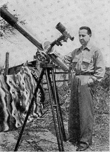 Paul sends no data on Figure 2. The photographs practically explain themselves and the detail is well worth close study. Paul submitted some beautiful stellar photographs enlarged to 6" diameter from the 1" diameter originals, but no attempt is made to reproduce them here, for the same reason that has excluded many others kindly sent to this department: The half-tone process degrades them all to the same low level, the good ones, the indifferent ones, and the bad ones alike. The chances are, however, that a capable wangler could wangle photoprints from Paul, if he could exchange some similar work of his own for them. This worker was a member of Scientific American's famous Amateur Roof Prism Gang. Too busy with his regular vocation to go into actual production, he nevertheless proved up his ability to make a high-grade roof prism, and then made a limited number in order to be sure he could do it every time. These tested up very well by others. To ex roof-prism makers the easier mirror work is going to seem like duck soup after the war. They'll be a kind of royalty of the hobby fraternity. ECCLESIASTICUS is one of the apocrypha and in the first verse of the thirteenth chapter it says: "He that toucheth pitch shall be defiled." (See "A.T.M.," page 359). Quite obviously the author or authors of Eeclesiasticus must have been trying to make a telescope. Here is a contribution by Dr. D. Everett Taylor, 191 Prospect St., Willimantic, Conn., who has touched pitch and been duly defiled, as have we all in our time. "Channeling a pitch lap is one of the headaches of telescoptics. Cutting shallow channels in a revolving lap, using the point of a pen-knife, is simple. Reasonably simple also is molding the channels in a large lap with the aid of a rubber mat. On the other hand, rolling or melting in the channels on a pitch lap already formed to curve distorts the pitch surface. Cutting pitch with a knife or razor blade is tedious. "The drill press furnishes a quick and highly satisfactory means of producing almost any desired type and size of channel. Point an old or broken twist drill with two pairs of surfaces at about 45° from the drill's axis, or point a large spike or rod with a similar, square, regular pyramid (spikes come already pointed that general shape but @ the angles are too steep). Run the tool , thus made at 600 to 900 rpm. , "Draw the lap, freehand, across the rotating tool thus made, until the desired width and depth are attained. An alternative, not quite so good, is a succession of slightly overlapping holes made with the same tool. "The quarter-inch tool will thus produce a wide variety of channels, both .1 in depth and width. For wider ones, increase its diameter." I UNARIANS will find much of permanent value in a 76-page booklet re-print of articles by Walter H. Haas, entitled "Does Anything Ever Happen on the Moon," originally published serially in The Journal of the Royal Astronomical Society of Canada. It contains a list of lunar observers, data on observational procedure, drawings, discussion of each, on lunar colors, on lunar changes (the essential subject of the writings), and on the lunar atmosphere, also an extensive bibliography. David P. Barcroft, First National Bank Building, Madera, Calif., a member of the widespread observing group whose work is discussed, has a number of copies but only a limited number, which he therefore will be forced to allot for sale only to those who can show genuine interest. Barcroft also is a member of the Telescope Makers of Central California of which Harry R. Lytle, of Madera, is now secretary. TEA PLATES for gauging the depth of concavity of a telescope mirror are described in "Amateur Telescope Making" by Porter on page 3, and by others on pages 310 and 344. While it is thought that a majority use the Ellison method of reflection from a wetted mirror, as described on page 78 of that book, some prefer the template, which is easier and simpler once it is made. Figure 3 shows how Warner Williams, connected with the Culver Military Academy of Culver, Indiana, made his template. Abrasive paper was glued to the face of a motor-driven wooden disk, and the metal template strip was attached to the radius bar, pivoted at the left, far out of the picture. This bar then was worked back and forth as the motor ran. There came, one day, to your scribe's office a large express package containing, when opened, the striking bas-relief, or plaque, made by Williams and shown in Figure. 4. This measures 3/9, x 12 1/2" x 16" and is made of cast plaster painted a delicate shade of green. William's letterhead indicates that he is a Chicago sculptor and designer. He made the bas-relief from the picture of Foucault on page 511 of "A.T.M." This copy, cast from a negative which he has, now hangs on your scribe's office wall beside the famous framed original focogram of Mary Everest's mirror (reproduced in "Amateur Telescope Making-Advanced," page 24). Williams has also donated duplicate copies of the plaque to Russell W. Porter and to Stellafane. He states in his letter what probably few amateur telescope makers know, that Cassegrain was a sculptor. BROKEN tool needn't mean a broken U heart. Cyril Gs Wates, Edmonton, Alberta, writes: "We are told in 'A.T.M.' what to do in case of a broken mirror, but not in the case of a broken tool. The latter is much more common because it is standard practice to immerse the tool in warm water to soften the pitch, and because tools are generally plate glass which has a high coefficient of expansion, and are therefore more likely to crack than Pyrex blanks. "My friend, H. W. Parnall, of Foothills, Alberta, recently had the misfortune to fall down the cellar stairs while carrying a 10a plate-glass tool. (Parenthetically, Mr. Parnall has a pet dog which weighs more than he does. When Fido gets hungry, his master goes out and shoots a moose. After satisfying doggie's appetite, Parnall sends me what's left of the moose. In return, 