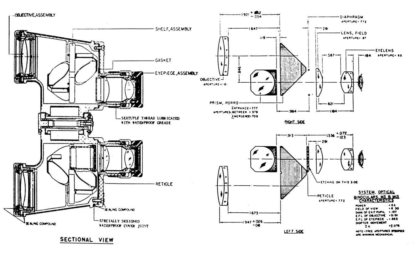 THE EMERGENCY precipitated by the impending World War II presented the United States Army Ordnance Department with the problem of immediate procurement of a large quantity o binoculars. Because of the urgency for setting up production it was necessary to select the most adaptable mode for which tooling existed and to produce approximately 350,000 instruments as quickly as possible. The model selected was the 6 X 30 commercial binocular being manufactured by the Bausch and Lomb Optical Company with whom an initial order for 20,000 binoculars was placed. This binocular was given the official nomenclature "Binocular, M3," indicating Standard Army Issue model No. 3 in the "M" series of binoculars. The 6 X 30 denotes six power magnification and 30mm objective diameter.
