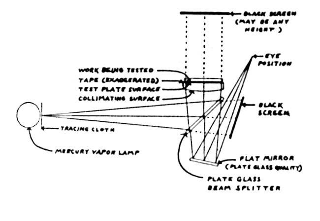 IT is commonly believed by opticians that interference fringes appear between optical surfaces only when they are in close contact with each other. This is the earliest form of optical testing in which the interference of light waves reveals minute irregularities on the surfaces. This method prevails to the present day. It has many disadvantages, but they can be overcome to a great extent through the use of air-spaced test plates. With the use of monochromatic light, a surface may thus be tested when removed many thousands of wavelengths from the test-plate surface. While there is no need for going to this extreme, there are many advantages in separating the two surfaces as much as 100 wavelengths (0.002"). This reduces the risk of scratching poorly cleaned surfaces, and increases speed many times over that of the conventional method. The ideal material for separating the surfaces is scotch tape. This material is uniform in thickness and, when properly applied at three equidistant points on the test plate, it is easy to maintain parallelism between the surfaces. For 2" to 4" test plates the tape is cut to 1/4" to 3/8" width and about 1" lengths. The cleaner end is applied to the surface, and the other end, because it has been handled when cutting to size, is folded down over the edge of the test plate. For this critical work the scissors must be kept clean. Any dust particles that are sealed under the tape add to the thickness of the air space, hence cleanliness must be the rule when applying the tape. For the same reason air bubbles under the tape must be avoided. To prevent curling of the edges and corners of the tape the test-plate surface must itself be cleaned with great care. When removing a grease film from the area near the tape rubbing must begin near the center of the tape and proceed outward to the glass. Dust is removed with a soft brush. An ordinary test plate, whether flat or curved, cannot be used with the increased air space without proper collimation of the light. The rays can be focused upon a flat, or on a curved surface by a lens system (Figure 1) on the back of the test plate, so that all rays will have normal incidence upon the surface being tested. The rays return in the reverse direction and the collimating lens system refocuses them upon the light source. Test plates of the usual type, optically modified by using the proper collimating systems but without spacers, are thereby decidedly improved. The fringes are more plainly visible on the steeper curves, and the readings are more dependable. Distortion due to oblique reflection angles of marginal rays does not exist in any collimating test plate unless there are serious errors in the collimating system. An off-axis point of view distorts the fringes. To maintain alinement of the axis a small spot of paint is applied to the center of the back surface of the collimator. When its reflection is hidden by the spot itself, the point of view is on axis. Only one eye can see the undistorted pattern, since both cannot be on the axis together. A beam splitter is essential to viewing the test plate on axis. This is a piece of glass, plane-parallel, polished on both sides, which reflects only a part of the light and transmits the remainder (disregarding the small portion that is absorbed by the glass itself). It works best with a thin coat of silver or aluminum on one side, but an uncoated beam splitter is satisfactory when the room is darkened. It makes no difference on which side it is coated, but the under surface is the more protected from dust. A piece of clear plate glass is good enough for this work. Figures 1 and 2 reveal the function of the beam splitter. It is important that the light source be made large enough to allow for changes in the alinement of the test plate axis, the same applies to the size of the beam splitter. An excessive amount of spherical aberration in the collimator also requires a large light source- to provide even illumination of the test plate surface. Any light source which radiates a small number of different wavelengths, concentrated into very narrow lines in the spectrum, is suitable for air-spaced test plates. Low-pressure mercury vapor lamps are better than high-pressure lamps, although the latter work well when the air space is not too great. Sodium vapor lamps are very good. Neon and fluorescent lamps can be used, but they are not recommended. Other types of lamps have not been used by the writer. The separation of two flat surfaces tested in parallel, monochromatic light, has little effect upon the reading of the fringes but with all curved surfaces the readings go concave with a widening separation of two matched surfaces, the change in the reading being in direct proportion to the amount of separation. The steeper the curves, the greater the number of Newton's rings for a given separation. When curved test plates are air-spaced, the test-plate surface must be altered from the true radius to a new curvature. In order to produce straight fringes, when testing the opposite curvature of the true radius, the change in radius is always made equal to the thickness of the spacers. Convex air-spaced test plates are made steeper, concave ones are made flatter, than the true curvature. When the new curvature is established, the air space must remain constant in order that the test plate can be relied upon. In practice this cannot be guaranteed, but there is another way to be sure of the test-plate reading. Although the spacers are not reliable in their thickness, the master test plate is reliable in curvature. The air-spaced test plate for steep curves therefore must always be accompanied by the master test plate. Straight fringes are no indication of the true reading unless they are seen when testing the master. When the master appears to be wrong, due to an error in spacing, this "wrong" reading is the correct reading for the work. The scotch tape spacers never grow thinner with use, althoug