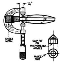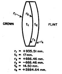 Asked to tell about himself, Driscoll says: "In 1930 I stumbled across the telescope making hobby when I was a ship model fanatic, and suffered a direct hit in the superstructure. I have had Carbo in my teeth ever since, having been an 'A.T.M.' (amateur telescope maniac) and made a 5" two 6" achromats, also eyepieces, prisms, and so on. I am now an experimental lens maker employed by the Eastman Kodak Co., Hawkeye Works. Thus you might call me a sort of amateur professional amateur." His article: SPECIFICATIONS-The data in Figure 1-the radii, r, each r being numbered with a subscript, and thickness t, similarly numbered-have been very carefully calculated to produce an ideal telescope objective. All tolerances have been worked out to give the greatest permissible leeway, for error in measurements. Crown component: Bausch and Lomb Optical Co. (Rochester, N. Y.) Light Barium Crown LBC-2 Nd 1.5711, V 57.3, thickness at center 17 mm, diameter 4-7/8" (thickness of blank 19 mm, diameter 5-1/4''). Flint component: Bausch and Lomb Extra Dense Flint EDF-2, Nd 1.6890 V 31.0, diameter 4-7/8", thickness at center 14.5 mm (thickness of blank 18.5 mm, diameter 5-1/4'') Finished diameter, 125 mm; e.f.1., 1480.82 mm (58.30"); focal ratio 11.84. Hold thickness of each component to plus or minus 1 mm; radii to 1 in the third significant figure (for example, plus 666.46 would be passable at 665.46). To convert millimeters to inches divide by 25.4. METHOD-In place of the method involving regrinding or repolishing the fourth surface to correct variations of curves on the other three, we shall first make concave test plates, or masters, to match the desired curve of each lens surface, controlling them by our familiar old friend, the Foucault knife-edge test, and then test our lens surfaces against these test plates by means of Newton's rings and the simple setup described in "A.T.M.," page 244. We shall then be sure that, since the original computations and specifications by which we make the masters are correct; and since we shall make the masters correctly to them; and since we shall make the lens surfaces faithfully to these masters, our achromatic lens itself will be-must be-correct. Making our test plates will be exactly like making spherical mirrors, but four spheres look like a lot of work. Let's investigate. Surface 1, the r1 surface of Figure 1, calls for one test plate. Surface 2 will be worked against surface 3, tool-and-mirror fashion; surface 3 becomes the test plate for surface 2. Surface 4 calls for a test plate. Net extra labor, therefore, two temporary test plate curves-minus the job of making a flat. For the first of the surfaces-surface 1 (+935.51 mm)-we shall use the crown blank as the tool and work a 5-1/4" disk of common one-inch plate glass to the corresponding concave radius; roughing, grinding, and fine grinding precisely as in producing a spherical mirror, as described in "A.T.M." To obtain the desired curvature, an arc of radius 935.51 mm is scribed on a thin piece of window glass at least 14" long, using a glass cutter, and this glass is broken apart to make a template ("A.T.M.," pages 310, 344); the best 6" section that shows evenness of break being used. Our tool when this is done, will be our crown component and will have been completely fine ground to curve on one side. For the other test plate, the one for surface 3 (- 666.46 mm), we use the other side of the crown as the tool and the flint as the "mirror," proceeding as before. The result is the flint fine ground to -666.46 mm and the second surface of the crown similarly fine ground to the corresponding plus curve. This finishes the grinding of the crown; care, of course, having been taken to bring it to the desired thickness-the computations called for 17 mm and we started with 19 mm, a 2-mm leeway for grinding. We also have, as has already been stated, a 1-mm plus or minus tolerance on thickness of either component. This will eliminate elaborate miking devices and automatically chloroform that bugaboo of the amateur optician, the fear of deviating from stated formulas. We would not ruin our reputation in optics nor would we spoil the performance of our objective lens if, on completion, the latter were to come out with a crown curve, for example, of plus 666.00. Any such I small percentage of error still will produce a good achromat and a pleased maker. In grinding a lens having a curve on either side it is important that the surfaces be centered with respect to each other; that is, that the optical axes of the respective surfaces be made to coincide longitudinally; otherwise we shall have what is termed a prismatic lens and this "prism" then could be removed only by centering the lens far below the diameter we want. The 5-1/4" blanks have enough excess of glass for centering out slight errors in edge thickness but, when grinding the second sides, we should occasionally check the thickness at several points around the circumference. Micrometering is best but measuring with a steel scale will be satisfactory at this stage. The mike shown in Figure 2, with some kind of stopblock attached, will give very accurate readings, but such close readings-an alternative for the most exacting amateur-are unnecessary. If one side shows thicker than the other, apply more grinding to the thick side. Stop occasionally moving around the lens and make extra strokes on that side. For the last step in the grinding operations we now take our flint blank which is already ground to the -666.46 curve (surface 3) and, turning it over and using it as a tool, place the plate glass test plate (which already has the -935.51 curve fine ground on it) flat side down and once again make a concave surface, this time -2884.64 When this concave test plate is finished in its fine grinding, the last side of the flint lens is also finished to +2884.64 so far as grinding is concerned. Care is taken again to bring it to tolerated thickness and to check for prism. O