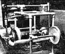 The action of the polishing part of the Paul machine may best be traced by starting at the motor, under the table, which actuates the grinding part described last month. From a 2" pulley (the remainder of the cone pulley seen in Figure 2 never being used) a V-belt passes up through a slot in the table and drives a 5" pulley which is eclipsed in the illustration. This pulley is attached to a short horizontal shaft, in this instance an old grinding head. On the left-hand end of this shaft (in Figure 3) is a head plate to which the mirror is attached with pitch. The mirror rotates constantly in a bath of rouge water and therefore requires almost no attention. This in turn requires that it be turned in an uncommon position-in a vertical instead of the familiar horizontal plane. Speeds of 70, 105, 140, and 175 r.p.m. may be chosen by selecting suitable motor pulleys. Suspended on an upright pin bar is the lap, which is held against the mirror by means of a spring or large strip of inner tube stretched to the desired tension as measured by a spring scale. The pin bar is actuated, pendulumwise by the horizontal overhead shaft, and this in turn is kept rocking by a belt-driven jack shaft and crank arm through an articulated pitman and pitman bar which is hidden in Figure 3 but visible in Figure 2. Stroke length may be varied by moving the crank pin along the crank arm. Stroke position is altered at will by readjusting a clamp at the top of the pitman. Unorthodox as it at first appears to be, this machine includes all the necessary elements and motions of an orthodox machine and, in fact, it is an orthodox machine turned up on its side in an unorthodox manner in order to make possible the added advantage of the rouge bath. If, for illustration, you take the commercial machine shown on page 83 of the 1944 printing of "A.T.M.A.," (Ferson's new chapter on prism and flat making) and tip it over on its side like a kicked-over table, you then have about the same principle. On the Paul machine, however, polishing is accomplished somewhat more by rotation than by cross stroke. "THE HORIZONTAL polishing system was first seen in the shop of Dr. Henry Ketcham, Johnson City, N. Y.," Paul states. "It offers certain distinct advantages, the major one being that, after initial adjustments on the job, it requires little attention, being semiautomatic. Since the lower edge of the mirror and of the lap dip as much as half way to their centers in the trough (old inner tube) of rouge water, the bother of applying rouge to the lap by hand is eliminated. It is true, the rouge water splashes all over the mirror and tool but a large washer photograph by Dr. Henry Paul Figure 3: Paul's polishing machine on the drive shaft, running just inside the trough, keeps most of it where it belongs. Another eliminated factor is temperature gradients due to evaporation effects. "Turned edges of any consequence have not been encountered (when the system was properly used). An added advantage is the fact that in the earlier stages of polishing, the trough that holds the solution may be moved up close to the mirror, thus keeping all the rouge in operation for rapid polishing. Then, as the end of the polishing is approached, the trough may be lowered, permitting the coarser particles to settle to the bottom so that the later stages of polishing may be accomplished by finely suspended rouge. It is believed that one reason for the outstanding lack of scratches by this method is the fact that heavy particles tend to stay in the bottom. This may also be why ordinary optician's dry rouge (B. and L. 21-90-61) works well. Since much of it is used, five-pound containers are obtained, but at relatively low cost. "The polishing progresses somewhat slower than by conventional methods but this is compensated in advance by thorough fine grinding with very fine emery, such as American Optical No. 305, the last application being worked down extremely well. Finest emeries should be levigated and mixed, one-tone, with levigated drugstore talc. I have never had a scratch from this method of polishing. "I have often started a mirror polishing in the late evening and leisurely after breakfast stepped down to the shop to find a completely polished surface within a few wavelengths of the ultimate. Thus I call this the nightshift machine; it works while I sleep. (Once I let it run 24 hours. No harm resulted.) To avoid the heartache, only too well known to all mirror makers, of fortuitously reaching a perfect curve before polishing is complete, and then helplessly having to watch its demise, I prefer to do the figuring on a finished polish. A small condenser bulb pen light and a 7X to 10X magnifier is used to best check for complete polish. "The free-running lap or mirror under the swinging arm pin is usually made about 5/6 to 9/10 the diameter of the driving lap or mirror on the polishing spindle head. Most often the convex form, whether lap or mirror, is on the driving spindle head and the concave form turns free on its supporting pin. Flats have been made both ways-most often, however, with the flat on the polishing head and the smaller polisher free-turning. The center of the free-turning disk is usually kept somewhat above or below the center of the polishing head. Often the edge of the free-turning lap comes within 1/8" of the edge of the disk it is polishing. This tends to avoid turned edge. Laps need only simple channeling-one groove across and three equally spaced channels at right angles to this. "Between adjustment of the length of the stroke the position of the sweep across the disk of the polishing head, the size of the outer versus the inner disk, the distance the center of the rotating disk is held above or below the center of the polishing head disk, and the reversal of position of the lap and glass, almost any desired effect in spherical or flat surfaces can be produced. "No attempt has been made to parabolize or produce aspherical surfaces on