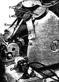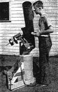 "W.W." is Warner Williams, Culver, Indiana, and at our suggestion he has now prepared a close-up photograph (Figure 1) of the driving mechanism of his telescope. "For the amateur," he writes, "this type of drive seems ideal because it does not require special cut gears to obtain a precise speed, this being taken care of through the ability of the wooden pulley J of required size, simply by turning it down to that size on a lathe." Williams' drive might most aptly be characterized as: (1) made from odd gears and elements picked up around home rather than sent away for, and (2) inexpensive. A is the current supply. B is the control cable leading to the hand. Switch at end. C, motor, 3500 r.p.m., Dayton Electric Co., Chicago. D, back gear. Reduces speed to r.p.m. E, universal joint. Dispensible. F, leather coupling. G, 2-to-1 spur gears from an old magneto. H, 2.2-to-1 spur gears. The smaller of these is behind and attached to the larger gear at G. I, worm gear, 50-to-1. From an old airplane carburetor. J, drive pulley (wooden) turned to the size which gives final desired speed. K, steel driving tape sliding on this pulley serves also as a friction clutch. This is especially convenient because it requires no manipulation at any time. The tube may be turned at will, without stopping the motor, yet when re-leased by the hands it starts following at once. L, idler pulleys to carry steel tape around the roller bearings, M. which carry the expanded polar axis. These are held in tension by means of a spiral spring attached to the respective pivoted arms which carry them. THOUGH at first glance the telescope shown in Figure 2, made by Arthur W. Sear, 550 Windsor Ave., Stratford, Conn., appears conventional, it embodies eight interesting features to which we will call attention by italicizing their key words in Sears' description, which follows: "Optically, the telescope is a conventional 6", f/8 Newtonian. My son is shown posing at the ocular and is holding the control box in his hand. The boy is nearly six feet tall, which will give a measure of the mount. "Detachable handles, inserted through openings and guides, are used to wheel the telescope, wheelbarrow fashion on its 10" rubber-tired wheel, from the garage to a convenient location. Removing the handles after the telescope is adjusted eliminates the danger of tripping over them in the dark. The power cord is long enough to permit setting up the telescope in any part of the lawn. The mounting is not excessively heavy and has a high degree of rigidity. The leveling screws could easily be a source of lateral wobble but this has been prevented by having the screws push down against a sturdy A-frame which is hinged along the base of the triangle, thus giving diagonal bracing. "In order to point the telescope accurately it is essential to have the polar axis properly oriented. To permit setting it up quickly have permanently attached a small auxiliary telescope just above and parallel to the polar axis This auxiliary telescope has a special home-made reticule with a small circle 1 degree away from the center of the reticule. The offset is very nearly equal to the declination of Polaris. A long focus ocular permits insertion of a prism diagonal between reticule and eyepiece. This makes for easy use without inverting the image at the reticule. If the reticule sleeve is turned so that the markings on the sleeve indicate local sidereal time, it is only necessary to jog the mounting around and adjust the leveling screws until Polaris appears in the center of the offset circle. The accuracy of alining the telescope by this method is perhaps within 5 minutes of arc, so that the probable error is well within practical limits. Setting up the telescope requires only a couple of minutes and the method permits accurate orientation of a portable telescope. "A type CZM Telechron motor housed in the square box drives the polar axis at sidereal time and works with negligible error through a gear combination of (51x79)/ (49x82), which is equivalent to the ratio given on page 322 of 'A.T.M A.' The polar axis drive includes a differential gear so that a small reversible motor can be switched on and off to move the telescope slowly in right ascension, for scanning slowly over an area of the sky, without interfering with the sidereal drive. The box mounted on the declination axis contains a similar reversible motor for scanning north and south. The scanning motors drive the telescope at approximately 6 degrees per minute. This speed is a little fast for the highest power eyepieces but is perhaps a good compromise when the low powers are considered. Friction clutches on both axes slip when the tube is pushed by hand from one part of the sky to another. The scanning motors are controlled by switches in a small box at the end of a 6' cable. A small electric lamp with a red lens is located in the end of the control box. This lamp is convenient when reading the scales or making notes. The red light does not seem to disturb the adaptation of the eyes to darkness. "The floating R.A. circle sidereal drive system ('A.T.M.', page 145) simplifies the problem of finding a sky object. The right ascension circle is mounted on a sleeve that is free to turn on the polar axis. The sleeve and circle are driven through an independent worm gear at sidereal time. If the right ascension circle is once set so that is position is correct it will follow the stars as long as the power is turned on. Two pointers, 180 degrees apart, are rigidly attached to the polar axis and are adjusted so that when the telescope is pointed straight up one of the pointers will indicate local sidereal time on the R.A. circle. Or, if the telescope is turned to any part of the sky, the pointer will indicate the R.A. of that direction. "The oculars are individually mounted in adapters which plug into the main fixture, similar to automobile lamps. Each eyepiece is focused by sliding it in its adapter where it is cla