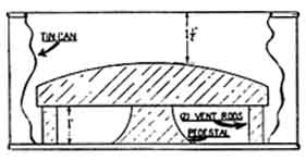 As was told in Scientific American, December 1943 and December 1945, in two three-page articles (which do not, however throw practical light on making metal tools for amateur glass pushers, though they are of incidental or background information interest) this ancient method which was once employed chiefly for accurate manufacture of small metal jewelry and dental parts is also being used today on a large scale for making precision castings industry, where it rates high. Driscoll writes: Into the life of every amateur optician there looms, at some time or other the specter of the iron grinding tool. Requiring a lathe and attachments to cut its convex or concave radii, the iron grinder becomes a thing of complex machining to the average basement glass addict. As a fellow "TN," suffering from lack of machine shop facilities, I wish to present an alternative solution to the production of the iron grinder. This requires a job of casting. The method is not claimed as new by the writer but its application toward solving the amateur telescope maker's difficulties is original. We shall cast our grinders in zinc, and the process used is termed the "Lost Wax Method." The low melting point of zinc (715 degrees F.) does not call for a high-temperature furnace. The gas stove of ye long suffering wife will suit the purpose admirably. The following materials and tools will be necessary. Plaster of Paris Paraffin Large tin can Scrap zinc . Rotating spindle (temporary) Glass gage of the desired radius. We shall assume that a grinder is needed for a 6" (152 mm) mirror. The grinder should be 5/4 of the mirror diameter or 7-1/2" (190 mm), but if the worker prefers the equal-diameter mirror and grinder, let him proceed on that basis. [The philosophy of the 5/4 grinder was explained by Driscoll in the October, 1945, number.-Ed.] The glass gage should be made from thin glass and as close to radius as possible. To begin, the paraffin should be melted in a container about 1/4" larger than the grinder diameter desired. After it cools, apply heat around the outside of the can until the block drops out. The aim now is to shape this paraffin block into an exact model of the grinder we are to cast. At this stage, we must have a rotating vertical spindle. This can be a temporary setup and does not have to be elaborate or complicated. The spindle speed should not be much over 100 r.p.m.-slower if possible. Here the amateur who possesses a polishing machine can leer with satisfaction. The spindle should have a flat, horizontal metal surface attached and on this we place our wax disk. We warm the spindle table, center the disk and allow it to cool. Now with a sharp knife we scrape, not cut, the disk roughly to curve and check the radius with the gage. When the disk is close to the gage curvature, we abandon the knife scraper and to finish the disk to curve we use the gage itself as a scraper. With the spindle rotating, we hold the gage to the surface of the disk and shave off all irregularities. We have now produced a grinder, modeled in wax to exact curvature in other words, a pattern. Now our large tin can comes into action. It must be at least 2" larger in diameter than our pattern. The pattern is mounted on a wax pedestal, two 3/8" wax rods are attached, and the whole is placed on the bottom of the can. See the illustration. The can bottom is then heated locally to adhere the wax to the metal and prevent shifting of the pattern. To forestall tipping, be sure that the pedestal and rods are of equal length. The next step will be making the plaster mold. Mix ordinary plaster of Paris thoroughly to a consistency that will just allow it to run slowly out of the mixing pan. It must not be putty-like. It must not be watery. Mixing and pouring must be completed in one minute. Time and plaster wait for no man. Pour this mixture into and around the wax pattern until every nook and cranny is full and the pattern is covered with plaster to a depth of at least 1-1/2". Allow the plaster to set for 48 hours in a warm room. Do not try to hurry setting by using excessive heat at this stage. With the mold firmly set we can now invert it and remove the bottom of the can with one of the new-fangled smooth-cutting can openers. The mold is now placed, pedestal end down, in a large pan. The mold must be placed on three blocks to keep it at least 2" up from the bottom of the pan. Be sure that none of the blocks covers the pedestal or the ends of the wax rod. Place the whole setup in the kitchen oven and bake it at 350 degrees F. until all the wax has melted and run out. Continue to bake it until certain that all moisture has been driven out of the plaster. As a test hold a cold metal surface to the hole in the plaster. If moisture collects on the metal, continue to bake until dry. Remove from the oven and allow to cool to room temperature. We now have evolved a plaster of Paris mold having a pouring spout and two vent holes to relieve trapped air in casting. Zinc is recommended as a casting metal because of its low melting point and its advantage over lead in point of hardness, but the home optician may substitute lead if he desires. The difference in price will be negligible. Lead will have the drawback of retaining particles of emery or Carbo in rough grinding that may cause trouble in the fine grinding. To the amateur who has access to large quantities of lead, we say use it, making a new mold and casting a grinder for each size of emery. Here again, as was stated here last October in an article on the hand-lever type of machine, may I mention that, by machine, 180, 500, and 1200 emery are all the sizes required to produce a perfect surface for polishing. Finer sizes will tend to scratch when used with a metal polisher. Place the plaster mold in the oven and heat slowly until it is fairly warm (200 degrees F). To ascertain the amount of zinc needed, weigh the paraffin model and multiply by 12 or 13. Melt the zinc on a gas flame and skim 