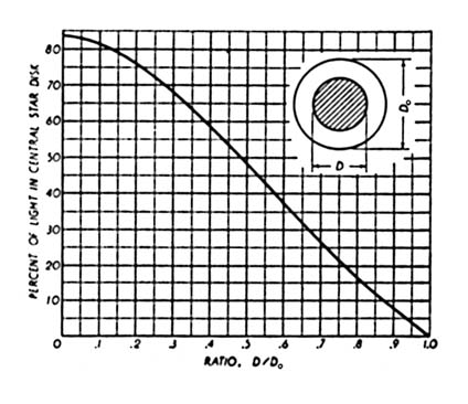 Equations (2) can also be used to find the minimum distance of an artificial star for testing a Newtonian primary, by letting 100(1 - N) equal the maximum percentage tolerance of figure. For example, a 6" f/8 could be figured flat to the knife-edge with the source as close as 30' from the mirror, and would still give excellent performance. A word should be said about the accuracy of equations (1) and (2), and the tolerances in figuring the mirrors. Kirkham's equation (1) is probably accurate enough for any system of reasonable dimensions. Trigonometrical ray tracing shows it to be correct to less than 1 percent of N for an 8" f/12 system with an f/3 primary, and again for a 10" f/19 with an f/5 primary. Equations (2), also owing their simplicity to binomial expansions, hold to the same order of precision. The tolerance of figure for a Cassegrainian primary is the same as if it were to be used for a Newtonian, and can be found from the table given by Wright in "A.T.M."; that is, the correction N, expressed in percent, may vary by the amount given in the table. The secondary may deviate from a true sphere by a quarter of a wavelength or half a fringe, provided the primary is perfectly figured, and should be tested by interference against its polished and figured tool*, or by the King test if optical glass is used. The above tolerances are for half of the Rayleigh quarter-wave limit, since the optical path error can be reduced to a quarter of its extreme value by proper focusing. Even the keenest observer can detect no departure from perfection of the image produced by a system corrected to within half of the Rayleigh limit. If the optical parts have been figured correctly, and the system properly collimated, the only reason for any relatively inferior performance is the diffraction effect produced by the secondary. Many writers have expressed alarm at the amount of light thrown by such obstructions into the diffraction rings surrounding the central disk. Few have considered the quantitative aspect of the situation. Two important effects are produced by the obstruction from the secondary. The most noticeable, of course, is the loss of light from the central disk and the enhancement of the first few bright rings. Assuming perfect optics, no spider diffraction (which is negligible, anyway), and that the obstruction is centered and circular, Figure 2 shows the amount of the total image light remaining in the central disk for various sizes of obstruction. (Strictly speaking this holds only when the obstruction is directly over the objective, but the effect of placing it several feet in front of the objective is practically the same.) Note that, with no obstruction, about 84 percent of the light is in the central disk. Now Conrady ("Applied Optics and Optical Design") has pointed out that, in the average case, at the Rayleigh limit this figure drops to about 68 percent. At double the limit, only about 40 percent of the light remains, but up to this point the size of the disk has not increased appreciably. Thus, considering Figure 2, a good reflector with a 25-percent-diameter obstruction would be at least as good as a refractor corrected to the Rayleigh limit. However, beyond apertures of about 5", the secondary spectrum of the ordinary f/15 refractor exceeds the Rayleigh limit for chromatic aberration. Even allowing for the decreased sensitivity of the eye for the scattered colors, it is hard to see how a large refractor could perform as well as any reflector of the same aperture; a long-focus Newtonian with its very small flat should be far superior. The second effect is a favorable one. As the size of the obstruction increases the actual diameter of the central disk decreases, becoming about 80 percent of the normal size for a half-diameter obstruction, and about 75 percent normal size for a three-quarter obstruction. This effect serves to compensate for the increased brightness of the rings by increasing the resolving power of the instrument. In fact, with a three-quarter-diameter disk over the center of the objective, it is quite possible that the Dawes limit could be exceeded. The net result of the diffraction is, of course, to obscure detail of very low contrast which is near the limit of resolution of the telescope, the bright rings from points at the edge of a bright area overlapping the disks from a relatively darker area. Since, for moderate sizes of obstruction, it is the first bright ring which will cause trouble, a rough indication of its effect may be obtained by considering intensity of the brightest part of the ring as compared to the intensity at the center of the disk. This is shown in Figure 3. It is seen that the secondary may be almost a third of the diameter of the primary before the ring has more than 5 percent of the intensity of the disk. At this point in the discussion physiological factors enter, but it would seem unlikely that the average person could detect any difference, in changing to a perfect refractor where the ring is about 2 percent as bright as the disk. All in all, one may conclude that the diffraction rings, so noticeable around bright stars, are not nearly so harmful as they would appear. Thus the modified Cassegrainian, while admittedly somewhat harder to make than a long-focus Newtonian, is not a very formidable project. The secondary involves only a sphere, the easiest of optical surfaces to make; the primary, since testing involves no zonal measurements, should be actually easier than the common Newtonian primary. Combined, the two make a compact and powerful instrument whose performance will leave little to be desired. GARAGE door becomes an alt-azimuth mounting for a Newtonian reflecting telescope in the yard of F. L. Frazine, 1016 Seventeenth Avenue North St. Petersburg, Fla. Through the door, near the outer edge, is a horizontal axle, the telescope's horizontal axis. Vertical axis then is the hinges of the door, which may be swung as a door usual