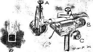 Now we have asked him to tell the telescope-making fraternity about that machine and here is his reply, illustrated with some of his incomparable drawings. He writes: Long past retiring age (75 last December) I still find myself fascinated with working optical surfaces. So I obtained three 8" Pyrex blanks and went down cellar where at odd moments I tried to make them flat. The machine used (Figure 1) embodies the Scotch yoke principle which favors compactness. Its base is a plank one foot wide and two feet long and it has a capacity up to 12" work. The 1/8 horsepower driving motor has a worm directly attached to the end of its armature shaft. To the top of the large worm wheel is attached a flat circular plate, its upper face carefully faced and lubricated. In that plate, extending from center to the edge, is a single radial slot. Locked at any desired position along the slot by means of the nut shown in the drawing, is a shouldered stud. Loose on that stud is a roller which fits the inside of the shouldered slot of the Scotch yoke shown. As the worm wheel rotates, the Scotch yoke unit is forced to reciprocate, constrained as it is by its guide rod. The other rod, the upper one, which carries the pin that pushes and pulls the work, has a rocker which confers freedom of action over any convex or concave surface. With the adjustments set as shown, a straight-over-center (radial) stroke of about 5" is given (the slot, 3" in length, permits a 6" maximum stroke). A complete stroke is made in about two seconds. A thumb-nut on the upper rod-the push rod-affords quick change of stroke range. If now it is desired to change to an off-center (tangential) stroke it is necessary only to loosen the little clamping lever near the base of the main casting, rotate the entire unit a little, and re-tighten the clamp. Thus the tool may be made to operate over any part of the glass. The vertical shaft has a sprocket pinion which, by means of a sprocket chain, rotates the work table at a reasonably slow speed. An idler takes up any slack. There are no creeping belts. I have noticed no tendency to produce periodic errors on the glass being worked. The only casting required is the one embracing the Scotch yoke. Now for the figuring of the 8" flats. I first tried the interference method described in "A.T.M." page 52. The fringes were normally observed some 10' away by introducing a sheet of window glass at 45 degrees just over the disks. The illumination is from a 2' mercury tube suspended from the ceiling, with tissue paper below it for scattering the light. The three disks slowly approached flatness, with an error of the order of half a fringe, or a quarter wavelength. Then, as an independent check and after considerable urging by Dr. Anderson, I made an 8" concave mirror of about 10' radius of curvature. With this set-up and a newly made knife-edge stand (Figure 2) I checked the flatness as described in "A.T.M.," page 42. As is called for in the figure on that page three motions were provided, one vertical (A), one transverse (B), and one longitudinal. At a is an enlarged view of the knife-edge window. With the pinhole image as shown, near the upper left-hand corner of the window, only a slight turn of the screws A and B will give the vertical and horizontal cutoffs. All three movements are controlled by gibs, and the screws (standard 1-1/4" diameter, 20-pitch) act against coil springs to prevent backlash by pre-loading. The illuminant is a grain-of-wheat lamp bulb covered with a wafer of finely ground glass. There are four pinholes in the little diaphragm shown, of varying sizes, to choose from. The bulb runs on two 1/2-volt flashlight batteries. The trough shown below the window is for an eyepiece, used when studying extra-focal images. It can be swung out of the way when observing the Foucault shadows. Comparison between the interference and concave mirror methods of testing indicates that there is about the same degree of sensitivity, and the two are mutually consistent throughout. At present all three disks are flat to 1/20 fringe, or 1/10 wavelength, which means departures from flatness of two millionths of an inch. They are not as good as those described by Selby, since they all have turned down edges of about one fringe. Porter was asked about scale drawings of the knife-edge stand, since readers will inquire. None exist. The drawing is practically self-explanatory. Dimensions need not be identical with those of the original. Pick your own. Porter added, "Yes, made it myself, filed all the gibs." RUMORS about inexpensive mirrors and lenses of plastics for astronomical telescopes persist. You'll soon be able, so 'tis said, to buy standard mirrors made in simple master molds and precise to 1/20 wavelength, figure perfect, for about five dollars. And, of course, after that you may feel a bit foolish working long hours over glass mirrors made individually. Many puzzled amateurs have asked about these rumors. Are plastics optics then that good? Or are they likely soon to be that good? Let's look at the evidence. In 1940, N.R.D.C., in final analysis the Government, awarded the Polaroid Corporation, Cambridge, Mass., a contract to do research on and develop plastics optics. Polaroid investigated 140 organic plastics and chose two as best for optics. To correspond with crown glass they selected polycyclohexyl methacrylate, or "CHM" (Nd =1.50645, v = 56.9) and to correspond with flint glass they picked polystyrene (Nd = 1.59165, v = 31D). These plastics may be poured, in molasses-like consistency, into molds made from glass masters made by conventional precision optical methods-hand work. Bake the filled molds in ovens and you have mirrors, prisms, or lenses. The optics made from these materials weigh only half as much as glass, are homogeneous, tough, substantially free from color, haze, and strain, and are stable under temperature extremes. They are, however, soft and more easily scratched than glass. Such o