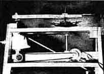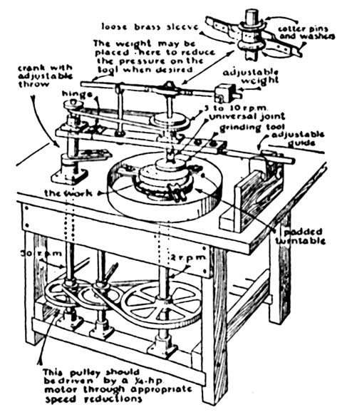 A 1/3 h.p. motor easily handled 31" tools for 36" mirrors on job described here last month. Here a separate turntable was used, driven from same crank. A car light-dimmer floor switch in the power line has been useful as a quick stopper for emergencies. Action of the polishing lap, free to rotate automatically, is interesting to watch. If the initial contact is poor the lap rotates retrograde from the arm but after a minute or two as contact improves it slows, stops a moment, then reverses; thereafter rotating in the same direction as the arm. Nearly all manufactured machines for use in the optical industry-that is, commercial machines-have free tools but Ritchey insisted strongly on driven tools, writing "the slow rotation of the grinding and polishing tools is rigorously controlled by pulleys and belts." Which, then, is the correct way? Proponents of each argue heatedly but the cynic punching the type mill on which these comments are written suspects that the correct way is largely the one you happen to adopt and get used to using. If this is the case, may it not be best to fall back on the principle, when in doubt plump for the lesser complication and resist temptations to exploitation of Yankee ingenuity. Arc stroke machines like "A.T.M.," page 163, B, are basically Drapers. Their "adjustable guide" feature shifts automatically each stroke, spreading the work over two zones. The otherwise elliptical stroke is deformed into a kind of bent hot dog shape. Triangular (German) machines like A, same figure, are still more versatile. Not shown in sketch is adjustable speed drive for secondary arm, also sliding attachment of that arm along main arm. Note that secondary arm may be lengthened, shortened. Gadget above letter A is a bevel gear screw for altering spindle level. On this German, Zeiss, or triangular machine the "adjustable guide" shifts automatically but not so often as in the arc-stroke. Back geared. Ritchey chose to shift this (his "transverse slide") by hand and often, but he usually worked on such big mirrors that this may have seemed to be a better way to distribute the work widely over the zones. Anyone who knew Ritchey might be likely to say that, with his meticulous nature, it would have been difficult for him to sit and watch the machine do it all. He would have to have a frequent hand in it. The transverse slides of his machines were equipped with a screw to perform this function which he did by means of a hand wheel (lathe type). This may have resulted in smoother progression across the zones but, avast, mention of this may lead some reader into the temptation to substitute a screw and wheel for the simple adjustable slide.