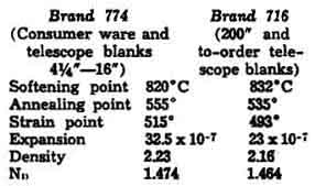 The ratio of linear coefficients of expansion is seen to be as .00000325 is to .0000023, or as 33 is to 23-about as 3 is to 2. In ordinary conversation glass technologists say merely "expansion 33" or "expansion 23," and on the same scale fused quartz (silica) has expansion 5 and plate glass 90. Why, you may now wish to ask, couldn't Pyrex Brand No. 716, the lower expansion brand, be just as easily used in telescope blanks as the 774? Be-cause it isn't in continuous melt. Much of it is in stock but it is cold. Obviously the telescope demand wouldn't begin to justify keeping it in continuous melt, and melting it is expensive in more practical ways than the one that is most obvious from the table- that is, higher softening point (more fuel). This softening point is only 12 degrees Centigrade, above that for Pyrex 774 but at the top temperatures involved this increment is appreciable. It took five weeks to melt 60 tons of 716 from which to dip enough to fill the mold for the 200" mirror. When an order for a blank of Brand 716 is filled, a special ceramic mold is built up, large irregular pieces of 716 are laid in it, cold, and melted down to shape of mold. In practical ways this is expensive. For example a single blank of 716, 16" by 3 1/3", was priced as of last spring, $198, and a 20" by 3 1/3" was priced $306. In club group of 24 blanks molded at on time the 16" blanks of 774 sell for $37.50 net. This department has now been urge to start a club of purchasers of 20" mirror blanks, as it did with I6" blanks. Investigation revealed that the economics in the two cases were dissimilar, with heavy accent on the dis, and no such club is in the offing. Suppliers and Organizations Sky Publishing is the world's premier source of authoritative information for astronomy enthusiasts. Its flagship publication, Sky & Telescope magazine, has been published monthly since 1941 and is distributed worldwide. Sky also produces SkyWatch, an annual guide to stargazing and space exploration, plus an extensive line of astronomy books, star atlases, observing guides, posters, globes, and related products. Visit Sky Publishing's Web site at www.skyandtelescope.com Sky