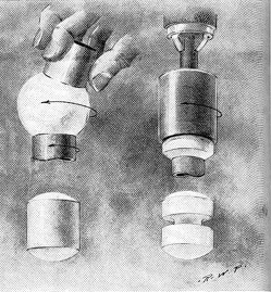 First of all, a piece of optical glass is cut down by sawing, chipping, or grinding to an approximate sphere perhaps 7/8 inch in diameter. The source of glass may be an old lens or prism or a chunk of rolled optical glass-borosilicate crown. (War surplus prism blanks sell for a few cents.) If handy, a wet glazier's abrasive belt sander will make quick work of it. Or the chunk may be rubbed to a rough ball on another piece of glass or metal with coarse abrasive grains and water. The ball is now ground to a perfect sphere by the method which has been used in China for thousands of years to make quartz gazing crystals. The method is still used by German lapidaries to make agate marbles. The rough sphere is ground in between two brass tubes charged with Carbo. The tubes should have walls from about 1/16-inch to 1/32-inch thick and have a diameter two thirds that of the rough sphere of glass. One tube is fastened to a vertical spindle and rotated at moderate speed by a motor. The ball is placed on top of this tube. The other tube is of the same size and is held on top of the sphere at an angle of about 15 degrees. The sphere is charged by means of a paint brush dipped in coarse Carbo and water. Carbo embeds itself in the soft brass a cuts the glass on a curve. The ball then rotates and is cut on all surfaces by the two tubes. This is the principle of the lens generator, the modern machine which makes spherical surfaces, and of the centerless grinder. The more the ball rolls the smaller and rounder it becomes. If you did a poor job of shaping the original rough sphere and tried to work a jagged chunk having sharp corners and deep fissures you may take solace in the original Chinese treatise on gazing balls which, translated, states: The going may be a little rough at first but it will soon settle down." To those who may ask whether the ball gets smaller faster than it gets rounder I can offer the accompanying table of figures on one I made. Grinding was started at 9:30 o'clock and proceeded with interruptions for changing abrasive and making measurements as shown. "Max. diam." was the diameter in inches across the longest axis and "Min. diam." the shortest. "Difference" is the difference between the two measurements and shows how nearly round the sphere was. The table shows that while the sphere loses size it gets
