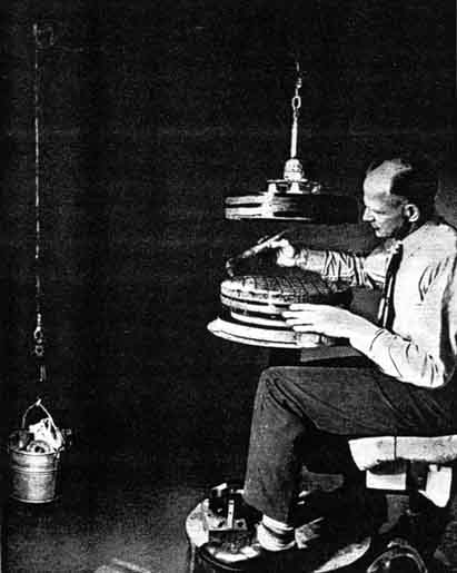 Dr. Robert E. Smith of Sacramento, Calif., has devised a simple, workable way to reduce the weight of the disk any desired amount by means of a variable counterweight. As shown in the illustration at left, the counterweight is a receptacle suspended from a steel cable over two pulleys at ceiling height. It is attached to the mirror by suction cups of the kind used to fasten skis to automobile tops. "When dampened with glycerine these cups really stay put," Dr. Smith reports, "yet they are easily removed with a knife blade." Just above the cups is an attachment for the cable, consisting of a ball-and-socket joint and a small tapered pin to facilitate detachment. Above this is a swivel, and then the cable. On the counterweight side of the cable is a scale for measuring the weight put into the receptacle beneath it. "My idea works," Dr. Smith declares. "I can handle the 16-inch disk as easily as I can an eight-inch in the ordinary way." In further description of the illustration, he adds, "The man seated at the grinding pedestal is Harold Simmons, president of our Sacramento Valley Astronomical Society. A small motor near his feet slowly rotates the pedestal, so that he or I can grind in comfort." Instead of standing and walking around the grinding pedestal, Lyle A. Ellis of Spokane, Wash., enjoys the sybaritic luxury of the mechanism shown in the illustration at right. "You sit," he writes, "on the embroidered feather pillow at the end of the jib arm, and kick yourself around the pedestal, which is a length of three-inch pipe set deep in the earth. To the top of the pedestal is welded a 15-inch pipe flange to receive the pipe fittings of the grinding tool (and of the mirror, whenever it is desired to shallow the curve by working with the tool on top). Surrounding the central pipe, beneath the pan for catching drippings, is a length of five-inch pipe. This rides on a large ball bearing at its bottom. The lateral thrust forces due to the worker's weight are transferred to the central pipe member through slots in the outer pipe, by means of two pairs of ball bearings that are mounted on stub shafts welded to the outer pipe." W. H. Newman of Ditchling, England, accomplishes the occasional rotation of the tool by mounting it on top of a vertical spindle that has a broad wooden disk near floor level which is turned occasionally with the feet. The relatively simple arrangement shown at left, a sketch by the late Russell Porter, is used by James J. Pflaum of Dayton, Ohio. It enables the mirror maker to sit in a chair with his work on another chair or a box and grind as good a mirror as if he stood up and walked round a pedestal, though he loses the fun of building a more elaborate rig. If now and then he unhooks the spring rod and rotates the mirror, he will get good results. Rotating the mirror or "walking round the barrel" can be greatly overdone, though no harm will result and the worker may even gain needed exercise. Until last-stage grinding neither component motion need scarcely be thought of. Of the two, the rotation of the mirror is the more important. So long as no deliberate pains are taken to replace the mirror always in the same position, accident alone will rotate it enough, just in the way it happens to be picked up and replaced on the tool. Increased care may be taken toward the end of grinding, and again of polishing. to ensure that it is rotated fairly often. Now consider the tool. Suppose that it were never rotated at all. and that the worker did not walk around it. As a result of the uneven application of pressure, it would grind too low on one side, but no great harm would be done. Devices for turning the mirror by exact angular fractions of 360 degrees have sometimes been devised. These tend simply to defeat the randomness of the rotation when no thought is given to the matter. Some workers have taken the "ring-a-round-a-rosy" principle of grinding so seriously as to perform a kind of dance taking one step around the pedestal for each stroke of the hands. This is mostly superfluous, but it may keep the worker's weight down. During most grinding and polishing the author takes about 16 strokes at each position without bothering to count the strokes. Even this is fewer than need be, but it changes the scenery. An interesting contribution to the lore of telescope making might be made by some inquiring mind. First he would rotate neither mirror nor tool, and see just how astigmatic the mirror would come out. Then he would rotate the mirror but not the tool, and measure the runover-heel effect on the tool. WHOEVER seeks to learn the best magnifying powers for telescopes should be prepared to do much scattered reading, find varying and contradictory statements and in the end not find the concise, unqualified answer he probable had hoped for. A correspondent of this department writes that he has been through all this, has waded through the literature, found it vague and confused, but has finally found terra firma. "This confusion,' he states, "is surprising, since there is a very simple mathematical formula, based on elementary physics and the anatomy of the human eye. The answer is clear and definite. The problem involves only two factors, the resolving power of the objective and the acuity of the eve. "The resolving power of the normal eye is one minute of arc. The best power of a telescope is attained by the combination of objective and eyepiece focal length that causes the resolving power of the objective and eye to match. To determine this we merely divide the 60-second resolving power of the eye by thc 4.56 seconds per inch of aperture of the familiar Dawes formula for separating power. There is only one definite answer. The best power is seen to be 13.16 times the aperture of the telescope in inches." The return to terra firma is indeed concise, and free from encumbering modifications of the kind that irritate the tidy mind. If we examine the literature of observing, however, w