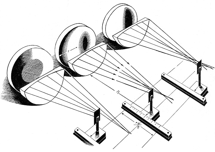 Such measurements are too delicate to be made with mechanical devices. Instead, a special kind of weightless and inflexible indicating pointer is used-rays of light. The drawing at the left shows in principle how such refined curves are measured. The following explanation is addressed not to telescope makers, who already understand its substance, but to general readers. For simplification some corners can be cut without harm. Of the three arrangements shown side by side in the drawing, only the central one need be noted at first. The three disks in the background may be ignored for the present. In the drawing, rays of light are directed at the mirror from in front of it; for simplicity these rays are not shown. If the mirror is spherical, i.e., if a large sphere would fit against it, these rays will all be reflected to cross one another at some single point in space. The method used to determine this is to locate representative reflected rays by means of a movable feeler. For this a razor blade on a little pedestal serves about as well as would more complicated apparatus. This "knife-edge" is slowly moved by hand from left to right, cutting off ray after ray, each of which is thus identified with the part of the mirror from which it is reflected. At a distance of a few feet these pointers of light greatly multiply the mirror's irregularities. Thus a millionth-of-an-inch change of angle on the mirror deflects the light-ray pointer an easily detectable hundredth of an inch at knife-edge distance. One deviation from the sphere that is actually desirable is the paraboloid. The mirror maker knows that he has deepened his sphere the few millionths of an inch needed to make it a paraboloid when the rays reflected from the inner part of the mirror (left-hand mirror) cross one another nearer the mirror than those reflected from the outer part (right-hand mirror) by a distance r2/R, where r is the half-diameter of the mirror and R is the radius of its curvature. The actual distance involved is seldom more than a fraction of an inch. The scale of things near the knife-edge is exaggerated in the drawing. An auxiliary method used by mirror makers for keeping track of the curve between spells of work is to set the mirror up on edge, as shown in the representations in the background, place the eye close behind the knife-edge, and move the knife-edge partly across the reflected rays. A paraboloidal mirror will then show over its surface a pattern of lights and shadows like the one in the central representation. The origin of this peculiar pattern-new moon on the left, oval on the right, with subtle intergradations-will be seen if the six typical rays shown are traced from the mirror to the knife-edge. Some rays are cut off by the knife-edge, and the corresponding areas on the mirror look dark. Other rays, swung farther right by a slightly . different angle on another part of the mirror, pass the knife-edge and enter the eye, making the corresponding part of the mirror appear bright. The patterns of shadows that are found on telescope mirrors as polishing progresses, some of them indicating excellent shape, others indicating evil shapes too numerous to mention, soon become as familiar to the worker as his own features. This exquisite and most revealing method is the "Foucault test" invented by the French physicist and telescope maker Leon Foucault, who described it in 1859. It has been said that the Foucault test changed mirror making from an art to a science. This is true, but the remainder of the present article will show that mirror makers before Foucault were not so much in the dark as such a statement might imply. IN 1773, 86 years before Foucault revealed his knife-edge test, William Herschel began making mirrors of speculum metal and of glass, ending about 1789 with a 40-inch mirror. Constance A. Lubbock, in The Herschel Chronicle, tells how Herschel tested his mirrors. Placing them temporarily in a telescope, he successively isolated three zones with masks and located the focus of each. He then figured the mirror till all three zones had an equal focal length. In 1924 the British amateur telescope maker W. H. Steavenson tested a dozen of these old mirrors that had been preserved by Herschel's descendants in the family home at Slough, 20 miles west of London. Steavenson's tests, made by the Foucault method, which was of course wholly unknown to Herschel, show that while Herschel sometimes grossly overcorrected his mirrors, he often obtained K proper correction. Steavenson's findings on 12 of Herschel's mirrors revealed the following conditions: Speculum mirror, 9-inch f7 Gregorian. Figure very even; one high zone. Speculum mirror, 7-inch f11 Gregorian. Figure very even, except for a narrow shallow zone. Speculum mirror, 6-inch f5.6. Figure only very slightly uneven, but 414 per cent correction. Glass mirror, 6 1/2-inch f13. Good polish. Even figure so closely spherical that no zonal test was made. Glass mirror, 8 1/2-inch f14. Figure very even, except for three narrow zones. Too nearly spherical for zonal test. Glass mirror, 6 1/2-inch f13.5. Even figure, except for two narrow zones, but 1,015 per cent correction. Speculum mirror, 5-inch f3.6. Figure even; no zones. Parabolic shadow, but too short a focus for testing apparatus. Speculum mirror, 9-inch f8. Very even, regular figure. Too nearly spherical for zonal test. Speculum mirror, 8.85-inch f14. Very smooth, nearly spherical and regular, except for a deep, broad zone spanning 40 per cent of the mirror's radius. Glass mirror, 9-inch f13, 1/3-inch thick. Too violently distorted when stood on edge to permit testing. Speculum mirror, 8.8-inch f13. Very even, except for three zones. No zonal test made because of nearness to sphericity. Speculum mirror, 6.1-inch fl3.9. A beautifully smooth curve from center to edge without sign of zones or other irregularities. Correction 62 per cent. In his book The Telescope, Louis Bell mentions Herschel's so-call
