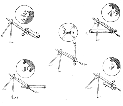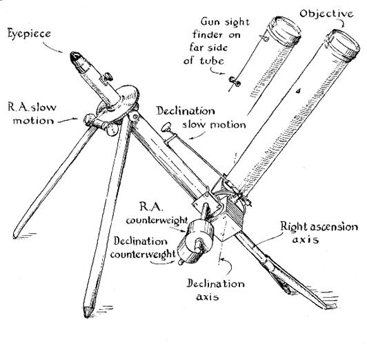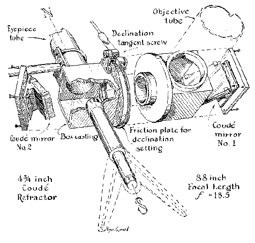 Thus the Gee telescope is an equatorial coudé, or "elbowed," refractor similar in principle to the widely known type devised in 1882 for the Paris Observatory. It differs from that instrument, which is diagrammed in Louis Bell's book The Telescope, in a number of excellent practical modifications which are of interest to all planners of small telescopes. "A refractor of this size on a conventional mounting would be extremely bulky," Colonel Gee points out, "weighing hundreds of pounds if it were to equal this one in stability. Even using the eyepiece on the coudé as the handrest when getting up or down from the observing chair will not disturb the image in the least. The reason is the location of the eyepiece at the highly stable apex of a broad pyramid. The instrument performs beautifully and is well worth the very considerable time and effort it took to build it. "Without its two removable counterweights the whole telescope, which is made almost entirely of aluminum alloy, weighs only 40 pounds and can be folded nearly flat and carried by one person. "The tube can be moved at will to a new part of the sky, and the slow motions take over from there. The right-ascension slow motion near the eyepiece is a 360-tooth 18-pi diametral-pitch worm gear. I cut this 6.4-inch gear on my Globe miller with a hob that was made from drill rod and hardened. I made the hob for a 14 1/2-degree pressure angle instead of using a standard tap because I have noticed that worm wheels cut with taps are not very satisfactory. "The declination slow motion at the elbow is a positive-action tangent screw without a spring, working on a floating friction plate in typical Springfield mounting fashion. "The right-ascension bearings consist of a 3 1/4-inch bronze sleeve bearing at the eyepiece end and a one-inch brass sleeve bearing in a forked 'mermaid's tail' resting on the ground. The declination bearings consist of a pair of seven-inch-diameter bearing plates that are integral parts of the two boxes containing the diagonal mirrors. The 3 1/2-inch-diameter hollow central stud has a threaded, removable retaining ring. "The rack-and-pinion focusing tube has a 1 3/4-inch clear aperture and permits the use of low-power, wide-angle eyepieces. Three eyepieces are used- a 1 1/2-inch wide-angle modified Erfle, a one-inch Erfle and a very good two-thirds-inch Brandon orthoscopic, plus a 2X Barlow lens. These three provide powers from 60X to 260X. The telescope handles the high power nicely. "The Barlow lens is a Laboratory Optical Company (Plainfield, N. J.) product of minus 4-inch effective focal length, mounted in a tube to provide 2X magnification. Various war-surplus Barlow lenses have appeared on the market in recent years with elaborate claims for impossible optical characteristics. Those I have examined are simply negative achromats of less than minus 2-inch focal length, far too short for optimum performance. Actually, minus 4-inch is on the short end of desirable focal length and minus 6-inch would be better. Barlows I have made for my own use are of minus 6 1/2-inch e.f.l. and leave nothing to be desired in performance. "The mirrors at the elbows are mounted on push-pull screws for adjustment and can easily be aligned by autocollimation. They are one-tenth wave aluminized optical flats and are highly important to the image quality. They must be mounted completely strain-free, and gave me much trouble until they were given three-point suspension on little cork pads that pinch them between the metal backing and the hold-down lugs. To give satisfactory results they should check within one-tenth wavelength of flat when mounted. "The finder consists merely of a rear peepsight with an eighth- to a quarter-inch opening (the exact size is unimportant) and a forward stud whose end is coated with luminous paint. Such a finder is very simple to construct, and is superior to the usual optical finder of considerably more complexity. With it an object can easily be placed in field of view of the telescope. "I did not make the objective. "Were I to build another telescope this type I would use ball bearings place of the upper sleeve bearing, whose inevitable play made it very difficult to adjust and maintain the fit of the right ascension drive gear. Ball bearings would alleviate this. Probably a pair of retainerless 'propeller-type' bearings or a single 'double-row' bearing, would best. In any case the two rows of balls would be necessary for stability of worm seat. "It is true that there is a loss of light at the two elbow mirrors of this telescope, but the loss is negligible." Amateur telescope makers of long standing will recognize Colonel Gee as the co-builder of the 12 1/2-inch reflector shown in Amateur Telescope Making-Advanced, pages 319-322, and more recently of a 20 1/2-inch Cassegrainian Portland, Ore. He also is the proponent of a practical method of testing Cassegrainian secondaries and the author of theoretical studies of that problem. Colonel Gee recently completed two years' study of optical design at the University of Rochester's Institute of Optics, and is now Chief of the Fire Control Division (which includes optics) at the Frankford Arsenal, Philadelphia, Pa., but he remains one of the widespread and enthusiastic fraternity of amateur telescope makers. Wherever his vocation sends him his lathe and other tools, like Mary's lamb, are sure to go. He has made numerous mirrors and flats, and also a dozen identical Barlow lenses of 1 3/8-inch diameter minus 6 1/2-inch e.f.l. IN THE DRAWING in Figure 3 Roger Hayward has worked out the effect of a coudé telescope on images of star groups or of the moon in four different attitudes for the four cardinal directions. (The images are represented by a letters.) If the objective tube of the telescope is shifted to the opposite side of the eyepiece tube, these different attitudes change still further. Thus it all seems to add up to confusion. In practice, however, the use