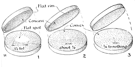 "Proceed with the next size of Carbo, and when the pits left by the coarsest size are removed a central spot of about one-half-inch diameter should remain as shown at 2, with a decrease in width of the untouched ring on the upper disk. The central spot should always be perfectly round and exactly centered. Any departure from this indicates astigatism, but can be corrected by working on one side to bring the spot to center. Similarly, on a concave surface press on a wide margin while grinding. The use of regular strokes, however, should avoid these difficulties. "Continue as above through finer grades until No. 600 or equal has been reached. Regular one-third strokes there develop a complete spherical curve, and the entire faces are fine ground, as shown at 3. "This method of grinding ensures that a maximum thickness of glass will be left. Professionals use cast-iron tools and high speed-200 to 300 revolutions per minute on spindles-but in grinding down the blanks a spot is left as described, to ensure full thickness at the finish." The attentive reader may inquire, "In what essential, if any, does the stroke described above differ from a stroke from the center toward the worker?" States Johns, "Theoretically it would be the same. However, pushing forward gives better control of pressure and of general manipulation while turning the disk. Pulling would probably bring it into one's lap. Exerting pressure while pulling the disk toward the near edge would be awkward. Also, for long grinding periods one applies frequent dabs of abrasive to the lower disk without removing the upper disk, but the substitute stroke would require placing dabs on the far side while the disk was being drawn toward the worker. By selecting the proper stance, arm's-length work should bring the center of the upper disk to the far edge of the lower where it can't be pushed off." Commenting on the case first described, that of Ralph B. Saunders, Johns wrote: "Using a Pyrex tool might lengthen the time consumed." Saunders soon reported: "I have discarded the plate-glass mirror disk for one of Pyrex, grinding it against the same Pyrex tool as before, and it is coming beautifully to curve without complications other than poundings on our door by the occupants of the apartment below us, who complain no less than before about the reverberations that resound from above them. What would Mr. Johns suggest as a remedy for this?" Many, including the writer, have ground Pyrex mirrors on top of plate-glass tools with no complications whatever; why then should the reverse create difficulties? In any scientific experiment it is a basic principle that only a single circumstance should be changed at one time: there should be but one variable. A big source of difficulty in the diagnosis of mirror-making ills is the fact that, by the nature of the work, more than one variable is often introduced without the knowledge of the worker. He may then attribute the outcome to the wrong factor and make erroneous deductions as a result. According to his temperament, he regards the baffling situations then produced as either a "headache" or a fascinating contest of wits.