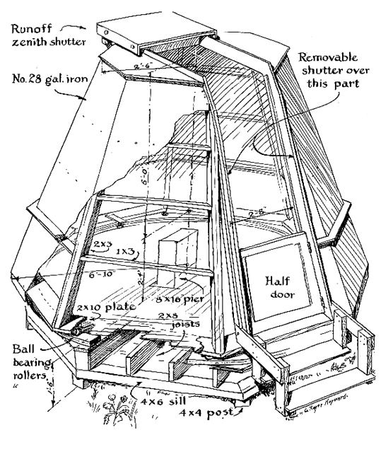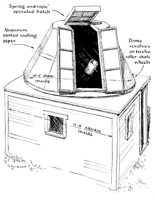 Nearly every telescope user dreams, however, of housing his instrument in a fixed observatory structure. A wide variety of such structures, all good, none perfect, are discussed in Amateur Telescope Making-Advanced. One rare type, shown in Roger Hayward's drawing below, was designated the "teepee" observatory by the late H. Boyd Brydon in a series of articles on "The Small Observatory and its Design," published in 1988 in The Journal of the Royal Astronomical Society of Canada. Its chief merit is its simplicity. It roughly approximates the hemispheric dome that pleases the geometric or esthetic sense, yet it does not require building the curved shape of such a dome. Not shown in this drawing is a third section of the slot closure that may be removed and set aside during use of the telescope. An example of the teepee dome is shown in Figure 1. Here it is set on top of a square building instead of on the ground. This is the observatory of Thomas R. Cave, 265 Roswell Ave. Long Beach, Calif. The simple 12-sided wooden frame of the teepee is covered with aluminum-painted heavy roofing paper. Though unbacked, and in use for some years now, it does not show the starved-dog's-rib effect of sagging that one might expect. In the top of this dome is a hatch that affords telescopic access to the zenith. The hatch is lifted by an automatic spring that is held down at other times by a line from below. The dome weighs about 400 pounds and rotates on 12 ball-bearing roller-skate wheels. It houses an eight-inch long-focus (f/10) reflecting telescope used for planetary observation by its owner. Cave is the Recorder of Observations of Venus for the Association of Lunar and Planetary Observers. 1 Association's mimeographed periodical, The Strolling Astronomer, enables amateur observers to "meet" each month and discuss their ordinary observations less formally than in a full-dress printed publication. MOST amateur astronomers would be happy to have in their back yard the combined garage-workshop-observatory shown in the drawing on the right. It was planned and built by R. C. Barton of 8265 Garfield Ave., Alameda, Ca., an electrical engineer and a former president of the Eastbay Astronomical Society of Oakland. Because of this observatory's height above the ground, surrounding trees (which never get shorter) are less likely to limit its visible sky than if it were situated at ground level. The building is 16 by l8 feet, large enough for a two-car garage. But one car is kept in it, the remaining space being occupied by the workshop filled with machine tools and benches. To gain space for any large job the car may be run outside temporarily. A practical consideration in the planning of this kind of unit is the fact that if the owner should later wish to move, the building could easily be converted to a two-car garage by the next owner. Thus expenditure for the observatory is justified on other than "frivolous" grounds. If suitably planned the entire observatory might easily be moved from the building beneath it. There is no inside stairway. The observatory is reached by climbing the outside stairway shown, crossing a south-facing lounging deck and entering through a large French door. In the daytime such a door lights the interior enough to make adjustments on the telescope possible in comfort. Some observatories are cavelike in the daytime even with the shutters open. The upper part of the Barton observatory is 10 feet square. Its top is finished to a circular opening with a wooden collar on which are fixed eight rubber-tired rollers. One of these is driven by an electric motor and rotates the dome. "Traction is obtained by levers and pulley blocks that permit me to control the upward thrust of the drive roller," Barton states. There are light fixtures in all four corners. Whole paragraphs of description of this dome are contained in the detailed drawing.