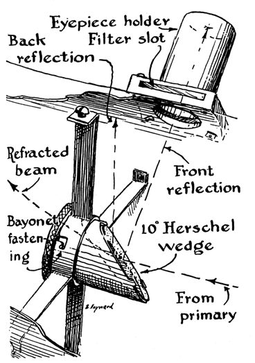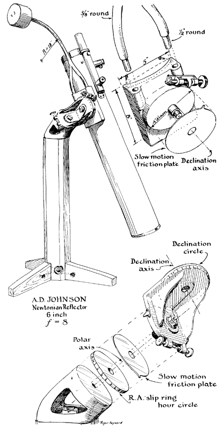 This compromise mounting was devised and built by A. D. Johnson of the Minneapolis Astronomy Club, who explains that "the base overhangs the north side of the pedestal in order to permit following a star through the zenith without the tube's encountering the post. This avoids the wearisome necessity of shifting it to the other side, it is the old and familiar bent pier. "Much of this mounting," Johnson continues, "has been copied from the Springfield, but the declination screw rides on the tube saddle where it is always handy. The castings were made in my basement. With a crucible, a bucket of molding sand, a little parting sand from a foundry supplier and a book from the public library, I went to work on the adjunct hobby of making patterns and molds and melting scrap aluminum in the furnace. Casting parts, rather than sawing and filing them out of solid stock, proved to be not only very convenient but also a lot of fun." The technique of molding and casting telescope parts is described in Amateur Telescope MakingAdvanced and in a chapter by Roger Hayward, the Pasadena architect, amateur telescope maker and illustrator of this department, in Procedures in Experimental Physics, by John Strong and others. "The saddle that fits the telescope tube was cast hollow," says Johnson, "with the ends straight across, and these ends were then cut to fit the tube. The counterweight arm has seven-inch horns that were welded to each other and to their extension by a blacksmith." Asked whether his patterns are available for loan to other amateurs, Johnson replied that "they are pretty well beat up, since at least 50 amateurs in and around the Twin Cities have had castings made from them.'' AN UNCOATED piece of flat glass could be used as the diagonal mirror in a telescope, but only five per cent of the light would reach the eyepiece. However, in observing one starthe sun it becomes necessary to throw out nearly all of a great excess of light. The piece of glass would accomplish this purpose, but it would produce a second image of the sun, not so bright as the main image and displaced from it due to back reflection from the inside of the rear surface of the glass. To solve this problem the younger Herschel, Sir John, tilted the rear face about 10 degrees to throw this back reflection out of the visual field. The result is called the Herschel wedge. "My Herschel wedge," Johnson writes, "has proved to be a useful instrument for observing sunspots, the moon ( except in its less dazzling first quarter) and Venus. The reduced light is easy on the eye, yet the reduction is accomplished without masking the outer parts of the mirror and reducing its resolving power or masking all except an outer ring and increasing diffraction. I altered the eyepiece adapter of my telescope to include a lateral outlet for insertion of the wedge unit (cutaway drawing in Figure 2 ) but found that on a refractor it was difficult in some positions to place the eye at the eyepiece." A better arrangement proved to be the one in the drawing in Figure 3. Johnson has equipped both diagonals and wedges with holders having bayonet fastenings, and states with enthusiasm that these always go back to perfect adjustment when charged. PROBABLY all amateur telescope users carry about with them, often for years, unsolved puzzles in the bottomless science of optics. They read articles and optical books. They ponder, study, experiment, discuss their problems with a fellow-sufferer, if they are fortunate enough to have one available. They read the same book 20 times. They pin down its language word by word and compare it with related fragments in other books. They wish the books would not merely state facts but would also point out which "facts" are false. Yet persistently from time to time new insights arrive, often suddenly. Blank walls fall down, and one day that particular puzzle is put down as solved. Then is the time for the worker to write about it for the benefit of others-not years later when he has become expert and his recollection of the struggle bas blurred. This is what David Rosebrugh of Waterbury, Conn., past president of the American Association of Variable Star Observers, has done by request after three years of groping with the language of standard treatisesspecifically Louis Bell's The Telescope and H. Dennis Taylor's The Adjustment and Testing of Telescope Objectiveson the subject of testing refractor objectives while testing three such lenses. If what Rosebrugh has written fails to impress the expert as containing anything not already in these books, it may be that the expert Unconsciously projects what he already knows into what he. reads. Anyway, in commenting on his own note Rosebrugh rightly states that "if I had had it when I started studying in preparation for testing my objectives I would have found the whole subject vastly easier than I did." The note follows: "Full instructions for testing a refractor objective assembled in a telescope can be found in standard works and, for those who are used to testing mirrors and complete reflecting telescopes, the reasons for most of the standard tests made on refracting telescopes are immediately apparent. For example, the necessity of aligning the optical axis of the objective with the mechanical axis of the telescope is obvious. Beyond a certain point, however, the testing of an objective diverges from that of a mirror. Once the reasons for this divergence are clear the reflector man will have no trouble in understanding the testing of an objective. This note will therefore be devoted to clarifying the one fundamental difference between testing a refractor and a reflector. "A natural question that arises in the mind of the reflector expert is, 'Why cannot one test-an objective by means of the Foucault knife-edge test?' The answer is that one could if one could secure parallel, monochromatic light (light of a single hue or wavelength). "It is easy enough to secure parallel light
