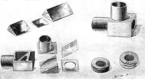 "Obviously," writes John M. Holeman of Richland, Wash., "what is needed is a piece of glass having only one side. A more attainable alternative is to use a piece of glass having its second side tilted with respect to the first, or front, side at an angle large enough to throw the secondary image out of the field of view of the lowest-powered eyepiece to be used. Since the field of view of most telescopes is narrow, an angle of 10 degrees between the faces of the prism is adequate for most conditions. This prism is known as the Herschel wedge or solar diagonal. The following notes describe how one was made. "The optical requirements of this prism are of the simplest. The first surface should be flat to a quarter-wavelength and well polished. The figure of the second surface is not important, since the image formed here is not to be used. The other surfaces may be left ground. This is one of the easiest prisms to make, and a good first project for the beginner in prism making. "The prism can be made from a rectangle of plate glass if a piece with one side flat enough can be found. If optical glass is desired a tank prism can be bought and cut down. Salvage companies furnish 90-degree prisms that have entrance and exit faces 1 1/2 inches wide and 6 inches long. The figure usually found on tank prisms is turned-down edge and ends. The faces are usually convex, one nearly flat, and the third may be anything. The flatness of the faces can be tested with interference fringes, and the best one chosen for the first surface of the solar diagonal. "After the best surface has been marked off with a wax pencil, it is covered with painter's tape or beeswax and the prism is cut crosswise to leave a rectangular face of the desired dimensions, as shown in the upper left-hand part of the drawing below. [The drawing was made to illustrate this article by Russell W. Porter shortly before his death.] This may be done by hand with a hacksaw blade and coarse Carborundum grains. "Next the prism is cut through at an angle to make a second face at about 10 degrees to the first. The rough sides are trued up and ground smooth, the first surface remaining protected by tape or wax. A stove lid or a piece of glass may be used as the tool, and the prism handground on it with Carbo and water. A high-grade prism may, if preferred, be made by the special method described by Fred Ferson in Amateur Telescope MakingAdvanced (printings since mid 1944) and then polishing as he suggests in a glass surround. This will produce a beautiful prism with truly flat sides which is really unnecessary for the purpose. The surfaces and ends may also be ground and polished by the same means if one is quixotic enough to put in an additional 42 hours, as I did. "There is so much opportunity for originality in making the metal parts of the accessory, and so much depends upon the equipment available to the individual, that a detailed description of a method would be useless except to a few. "The mounting needs a tubular extension in the end that fits into the telescope where the eyepiece normally goes (the left-hand end in the illustration) and a holder at right angles to it to take the eyepiece. Between these, and at the vertex of the right angle, should be the first face of the solar wedge. This should be tilted at 45 degrees, with the thick base toward the eyepiece holder. The rear of the housing should be left open to allow the direct light and heat of the sun to escape. The simplest means of supporting the wedge is to put it behind a cut-out plate of metal slanted at the proper angle and held in place by a retainer of wood, as shown in the drawing. The completed assembly is shown at the upper right. "Besides the prism, a dark filter is needed at the eyepiece. For the sun a war-surplus dark neutral filter (No. 605) may be had from a salvage company. For the moon, where there is also an excess of light, the light neutral filter No. 604 is excellent. It is desirable to mount the dark filter as close as possible to the eye lens of the eyepiece, so that the eye can reach the necessary eyepoint, which is pretty close in most telescope eyepieces. This is usually done by burnishing the filter into a thin circular cell like the left-hand one of the two in the lower right-hand quarter of the drawing. This cell is substituted for the screw cap of the eyepiece. A setscrew in the edge will keep it from falling off. The technique of burnishing or crimping in the filter is the same as for a lens, and is described by Porter in Amateur Telescope Making, page 70: a thin edge is turned up and rolled over against the glass with a small roller while the lathe is running at its fastest speed. In Lens Work for Amateurs Henry Orford very briefly describes this process and shows two lathe tools for burnishing, one a cutting tool with profile that excavates a hollow near the edge, the other a little roller. However, the job may be done with a round-ended tool having no roller. "If the variable filter shown in the lower right-hand corner of the drawing is preferred, it can be made from two small Polaroid filters No. 688. If one of these remains stationary and the other is rotated on top of it, the light will diminish gradually from about 35 per cent to practically zero. One way to mount this is to burnish one Polaroid into a rimmed cell, as with the simple filter, and to burnish the second Polaroid into a thin disk fitting into the cavity in the first cell. A retainer sprung or screwed in place keeps the whole assembly together. Rotation of the inside filter is obtained by 3 screw moving in a slot in the rim of the outer cell and threaded into the inner disk. The protruding head of the screw serves to rotate the filters." After Holeman wrote the preceding article and Porter illustrated it, a question arose whose largely negative answer may nevertheless have positive value. This concerns possible injury to the eye of the observer from continued use of the second of 