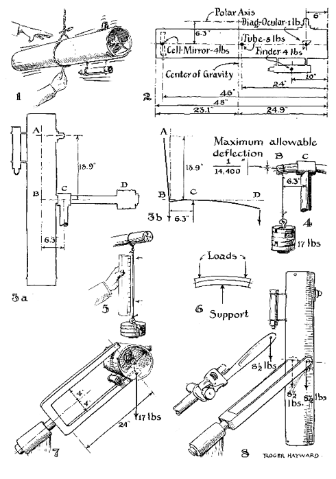 No exposition of the engineer's method as applied to telescopes has ever been published. Writers, including the present one, have merely urged the use of massive, rugged mountings to avoid vibration at the eyepiece. This advice as not been accepted by all amateurs, many of whom follow the good American tradition of ignoring precept unless the reasons for it are explained, understood, believed and liked. In the exposition that follows, the amateur telescope maker Roelof Weertman of Beaver, Pa., explains step by step the engineer's approach to the design of a typical telescope mounting by stress analysis. Thus the beginner may now design his mounting scientifically, while the more advanced amateur may check his telescopes by this method and find out whether he is an unsuspected engineering genius. Weertman writes: As an example for stress analysis we may choose the familiar beginner's 6-inch f/8 reflecting telescope. First, find the point of balance of the tube unit. This may be done quickly by the method shown at 1 in the illustration at right, but the alternative method shown at 2, though consuming more time, will have more interest, and while we are at it, we may as well be scientific even if it kills us. (The method has other uses.) Weigh the assembly parts of the telescope-tube, cell with mirror, diagonal support with eyepiece, and finder-and record their weights. Then assemble the entire unit and, as shown by the large dots at 2 in the illustration, mark on the tube the approximate center of mass of each part and complete a layout like the one shown. Now tabulate for each unit the product of its weight and its offset distance from the right-hand end of the tube. For example: