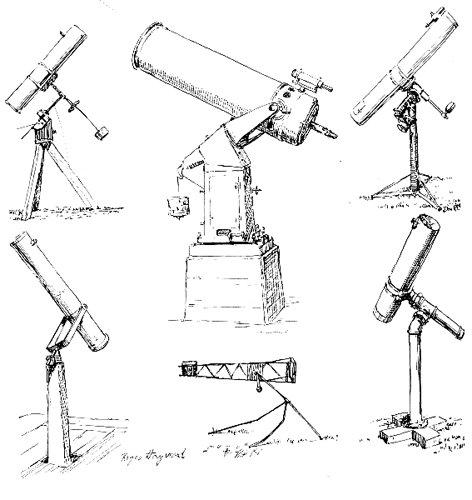 of the cross-member. The formula is THE preceding analysis by Weertman is offered as the opening of a campaign to change the design of the amateur's mountings from an art, as at present, to something approaching a science, and with the aim of including an analysis in a future printing of Amateur Telescope Making. Space in that book for not more than 1,730 words may be found by discarding the matter now on pages 157 to 159. No prize is offered for the best exposition of mounting design by engineering stress analysis other than the mention of the author's name in a by-line in that book; such mention would, however, embalm the winner as one of the classic granddads of the hobby. The analysis should not be aimed at the engineer or the long-haired advanced amateur but at the beginner, who is the one most given to building what Weerhnan correctly calls pantywaist contraptions mounted on hairsprings and jelly." THE drawing above shows some outstanding mountings, both bad and good, that amateurs have built. They were drawn from original photographs without caricature and without change in the proportions of the axes. In the mounting in the upper left-hand drawing the lower portion of the polar-axis shaft has a diameter of only 5/8-inch, and the lower extension of the declination-axis shaft, carrying a heavy counterweight, is only 3/8-inch in diameter. The builder of this mounting was a student in a famous engineering school! The fork mounting in the lower left-hand drawing was made by folding a length of 3/8-inch strap iron, and would sag excessively. The polar axis of the mounting in the lower central drawing consists of 1/2-inch pipe, mounted on its crane-fly legs of slightly larger pipe. Whether this mounting deserves to steal away the prize from the first of the three remains a question. These, of course, are extreme cases. Examples of adequate or more than adequate mountings are shown in the remaining drawings. The 12-inch Cassegrainian in the center, designed by Russell Porter, has an adequate fork of sweet proportions. The instrument in the upper right-hand drawing, built by F. L. Prescott of Dayton, Ohio, is adequate throughout. The mounting in the lower right-hand corner, built by H. I. Linn of Oakland, Calif., carries a six-inch telescope on 3 1/2-inch pipe fittings which include a heavy steam-pipe saddle used as the saddle for the tube. Despite the ruggedness of this mounting it required no machine work.