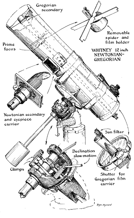 The telescope is shown as a visual Gregorian in the drawing. The eyepiece is at the lower end of the tube. At the opposite end a small concave secondary mirror reflects to the eyepiece the rays it receives from the large primary at the bottom. (This is shown more clearly at the upper left of the drawing on page 78.) The effect of these reflections, made at angles determined by the calculated curvature of the paraboloidal primary mirror and the ellipsoidal secondary, together with the effect of the added double folding, is to shorten the telescope greatly. The tube of this one is 56 inches long, with an effective focal length of 205 inches; a simple telescope with the same magnification would be about 17 feet long. The gains of the Gregorian, however, are not obtained without certain losses; this is nearly always the case in optical design, which is by nature a compromise. Shaping the curve on the small secondary mirror is a fussy, delicate task. Lining up the mirrors of a compound telescope is another delicate job. The observer may pay with a wry neck and sagging knees for the whim of looking in the direction of the object. The image is erect, but astronomers are accustomed to inverted images and find erect ones abnormal. (This feature nonetheless makes the instrument useful as a terrestrial telescope.) The Gregorian's virtues include a higher magnification than the Cassegrainian, another type of compound telescope. In any case, the beginner should make two or three simple telescopes before tackling a compound such as this. In the second of the four uses of the Whitney telescope, a film carrier is substituted for the eyepiece at the bottom of the tube, and photographs are made. In the third use, as a visual Newtonian, the Gregorian secondary mirror remains in the tube but is nonfunctional, and the Newtonian secondary and eyepiece carrier unit is inserted and quickly latched to the side. Its secondary mirror, a flat diagonal, intercepts the rays from the primary and reflects them to a position outside the tube where they can enter the eye, as shown at the upper right in the drawing below. The f/3.45 low-magnification Newtonian, best adapted for viewing faint objects, may also be used on the planets when the earth's atmosphere is so unsteady that high magnification causes greater loss in sharpness than gain in size. Finally the Newtonian focus may be used photographically, not by substituting a film holder for the eyepiece, but by inserting it directly at the center of the tube and taking the photograph at the prime focus. This eliminates one reflection. The Whitney telescope has many fine mechanical and optical features. The mirror cell at the lower end of the tube is made from an automobile brake drum; its central opening is covered with a metal plate to which the eyepiece and assembly are attached. When a photograph is to be taken, the eyepiece is taken out without removing the assembly, and a metal box with a 4-by-5 cut-film holder is attached by side clamps. A Packard-type shutter inside the cell is operated by a rubber air bulb. A photograph of the moon taken by Whitney looked so fine that it was sent by this department to Dr. Henry Paul, an advanced amateur who specializes in astronomical photography. He commented, "This is the best moon picture by an amateur I have ever seen." (He modestly omitted his own.) When the sun is to be photographed, a tube with a Polaroid filter hinged at its top is inserted through the hole in the primary mirror and screwed into the backplate, the Polaroid filter is flipped into the path of the light rays, and the primary mirror is stopped down to one-eighth area. This tube is long enough to serve another function: it shields the eyepiece from the direct light of the sky. Otherwise this sky-flooding glare would render the Gregorian virtually useless as a daytime terrestrial telescope. The instrument is mounted on a deep broad concrete pier by means of a five-inch 45-degree pipe elbow. Inside this elbow, running on a propeller-pitch type bearing, is the combined polar-axis and declination-axis unit. This was machined from a 1928 Chevrolet differential housing. Fine adjustment is imparted to the two-inch declination shaft by hand screws on either side of the mounting. These work through a linkage to a sawed-off connecting rod bolted to the shaft. The guide mechanism, rebuilt from a war-surplus bomb-train intervalometer has a knob that affords manual control of the driving rate for guiding the telescope during photography. Guiding is done with a 3 1/2-inch elbow refractor of 40-inch focal length attached to the tube but not shown in the drawing. The rectangular object shown near the center of the tube contains a battery for illuminating the reticle of the guide telescope. The drive motor is a synchronous General Electric phonograph turntable motor, and the gear train is built up of spur gears. The 12-inch primary mirror was made from a very ancient disk of green porthole glass two inches thick, obtained from a ship chandler. Today plate glass is not made thicker than 1 1/2 inches. Theoretically Pyrex is three times as good a mirror material as plate, since its expansion coefficient is only one third as great, but arguments could be adduced that in practice might narrow this difference considerably in most cases. During the excavation of the concavity, which is almost a quarter of an inch deep, the loss of glass thickness by grinding was held to a minimum by the use of sub-diameter tools. The mirror curve was excavated to about two-thirds the ultimate depth on top of an 8-inch tool. The hole was then bored from the face to within 1/2-inch of the back. Next, the same tool was used on top until the curve was nearly excavated. Then the hole was deepened to within 3/16-inch of the back and the slot was packed with wicking and paraffined over. Polishing and figuring were done face up, by hand, with the mirror on a turntable driven at six revolutions per minute. A