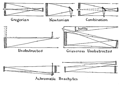 A NEW WAY OF FOLDING the optics of a telescope into zigzag form to keep the length within reason, as in the Gregorian and Cassegrainian, has been suggested by Daniel E. McGuire, a Pittsburgh professional optician. McGuire began as an amateur, and retains the keen interest in amateur optics of all who add professional to amateur status. (This combination, impossible in athletics, is harmless in optics. ) He writes: "I had the lucky opportunity to look through the most perfect telescope that I have ever used. It was one of the off-axis reflectors of Norbert J. Schell of Beaver Falls, Pa. For the first time in my life I have seen in great detail the belts of Jupiter, yet the aperture of the telescope was only six inches. I couldn't get away from the impression that I was looking through a much larger telescope. The high power that goes with its f/21 ratio probably contributes to that impression." Schell has promised this department a description of this new telescope, called the "oblique Cassegrainian." Two of his off-axis telescopes were described in this department in April, 1939, and May, 1940. The principle of the first is shown at the left side of the second row in the drawing in Figure 2. The mirror is a section from one side of the imaginary paraboloid shown by dotted lines. The object of the design is to eliminate the evil diffraction effects due to a secondary mirror or a diagonal. Schell emphasizes this fact by calling the telescope not an off-axis but "the unobstructed"; the off-axis mirror used in it is merely a means to avoid obstruction. The value of eliminating obstruction had been borne in on Schell after he repeated W. H. Pickering's experiment, described in Amateur Telescope Making -Advanced, page 618, in which Pickering gained refractor performance from a reflector by temporarily avoiding obstruction. Schell also conceived and-with T. G. Beede, who made the off-axis mirror- constructed the "crisscross unobstructed" instrument shown in the next drawing. Here the optics are folded triply into a short tube, and light baffles prevent direct sky-flooding at the eyepiece. MeGuire's present proposal was inspired by the fact that Schell recommends, as others have, a closed tube as an added refinement for his unobstructed telescopes. McGuire writes: "If one goes so far as to use a window to close the tube, why not make the window in the form of an achromatic lens of very long focus? Then the 'off-axis' mirrors could be plane mirrors, which are much easier to make. The length of tube usual for a refractor having a ratio of f/15 would accommodate a ratio of f/45. For any given magnification color fringes would be reduced to a third of what they are in the typical refractor." McGuire continues: "The idea of making a refractor with an unusually long focus to reduce the effect of the secondary spectrum came to my mind when considering the difficulty of making off-axis mirrors. The refractor is much easier to make, although the greater focal length brings about mounting problems. In Telescopes and Accessories, by Dimitroff and Baker, page 27, it is stated that the focal length of an achromatic objective with unobjectionable color aberration is given with sufficient accuracy by the formula f = 5D2. By this standard a 3-inch objective having a focal ratio of f/15 has unobjectionable color. A 6-inch at f/30 and a 9-inch at f/45 would have the same amount of color at a given magnification per inch of aperture, but the telescope would be much too long in the conventional straight-line design. "At the expense of using a wider tube and including auxiliary plane mirrors, the tube length can still be kept within convenient proportions. Two types of 'achromatic brachytes' are shown in the drawing. Mounting possibilities would include the Springfield arrangement with the eyepiece on the polar axis and the coudé Cassegrainian (Amateur Telescope Making, page 452) with eyepiece near the declination axis." IN a frequently quoted article in the 1 February, l938, issue of The Journal of the British Astronomical Association, H. E. Dall of England described experiments on "diffraction effects due to axial obstructions in telescopes." Using various sizes of central obstruction, Dall made photographs of artificial planets consisting of a uniformly illuminated aperture overlaid with wires corresponding to lines 42, 84 and 168 miles wide on the Martian disk. Under these controlled laboratory conditions, which he described in a private communication as an attempt "to find out how much effect was due to the central obstruction and how much to air-current trouble in open tubes," he demonstrated that the effect of diffraction is to reduce contrast as well as definition but that "if the central obstruction does not exceed one fifth of the diameter of the aperture no serious loss of detail contrast occurs. Above this proportion of obstruction a noticeable falling off of crispness of detail results, accompanied by a growth of spurious detail and diffraction haloes." To avoid losses even less than serious, Dall still recommends the method of minimizing obstruction that he described on page 584 of Amateur Telescope Making-Advanced: a tiny prism just a little inside primary focus feeding the rays to a good erecting system. "By this means," he says, "I brought the secondary obstruction down to less than 6 per cent of diameter or .36 per cent of area, and got an erect image too." "Of course," Dall adds, "for real simplicity and merit the oldest of the lot, the Herschelian, takes a lot of beating, as I am always trying to drive home. The decentering error can be reduce in several ways to less than the Rayleigh tolerance, provided the focus is not mad too short, say, less than f/8. Off-axis cylinders or lens tilts will do it."