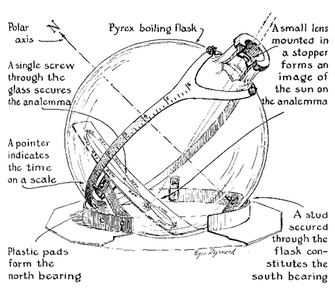 | From an illustration of a dial designed and built by Russell Porter and described in this department, Ronald F. Scott, Box 84, Johnson City, Tenn., made a similar dial with minor improvements. "A really good sundial had been the object of my search for years," he writes. "I tried several built on flat plates but they had many shortcomings. Porter's sundial, with its analemma curve and lens for focusing the sun's image, masters practically all the difficulties with remarkable simplicity. I have been gratified to find that this dial is accurate. The readings vary by no more than one minute from correct time, and often the two match." Roger Hayward's drawing at the left was made from Scott's data and from familiarity with the prototype in Porter's garden. The tiny lens, only a quarter of an inch in diameter and equal in focal length to the radius of the analemma plate, is mounted in a 12-liter boiling flask obtained from the Corning Glass Works, Corning, N. Y. The curve of the "equation of time" or error of the sun (actually it is the earth that errs) is inscribed on a metal sheet inside the flask; it is the mirror image of the one that appears on a globe. To find the time, the flask is grasped by the neck and rotated on the stud in the lower right-hand part of the illustration and on the two supporting pads until the sun's image bisects the curve. This image then gives the date; the time is read on the scale surrounding the flask. "The polar-axis stud is tapered," Scott writes, "to fit a tapered hole in the glass, and sits in an adjustable thrust-bearing. The two pads that constitute the north bearing are adjustable vertically, and final adjustment of the sundial is achieved with them. A second hole must be drilled in the flask for the post that holds the plate in position. I spent considerable time trying to figure out how to locate the plate correctly before I struck the happy thought of suspending a plumb bob through the stud hole so that the string represented the axis of rotation. Sighting through the center of the lens enabled me to align the longitudinal axis of the plate quickly, and the transverse axis was positioned by using a level line of sight through the lens. I marked a cross on the flask at the end of the axis opposite the stud hole to show the pointing of the bob in checking the inclination of the axis during adjustment. A lead weight was later mounted inside the flask behind the analemma plate to balance the weight of the neck, as the flask tended to creep in some positions." Scott's improvement on the prototype is in waterproofing the dial by using copper instead of paper for the time band. Porter warned that extreme care must be taken to locate the stud hole accurately. The holes may be made with a hand drill, an inch of tubing and wet abrasive grains. Scott's tapered hole insures against looseness. IN spite of a widespread impression, it is not easy to know the inventor and the date of invention of such things as the steamboat, the telegraph and the incandescent lamp. The same applies to the reflecting telescope. He who turns to history to find the solid ground of fact will soon find himself bogged in ooze. Was the inventor of the reflecting telescope the English astronomer John Hadley, who in 1723 made the first good modern reflector with a paraboloidal mirror? Or was it Sir Isaac Newton, who in 1668 built the first reflector with an eyepiece, though he knew no way to parabolize his spherical mirrors? Was it the Scottish mathematician James Gregory, who five years earlier proposed the type of reflector known today as the Gregorian, though for lack of manual dexterity he did not build one? Was it the French mathematician Marin Mersenne, often called Mersennus, who proposed the idea of a reflecting telescope to the French philosopher Rene Descartes in 1689, only to be told that it was fallacious? Was it the English mathematician Leonard Digges, who used concave mirrors before 1571, though probably without an eyepiece and as terrestrial telescopes? Was it the English philosopher Roger Bacon, who with Peter Peregrinus spent three years and the equivalent of $3,000 learning to make concave mirrors in approximately 1267? That Bacon even then understood spherical aberration is shown by his statement that the focal length is much less for rays from the outer zones of the mirror, and that it is half the radius of curvature. He left no record of the uses of the two mirrors that he made, but L. W. Taylor of Oberlin University tells us that a century later Peter of Trau recorded the tradition that with Bacon's mirrors "you could see what people were doing in any part of the world." He adds that the students at Oxford University spent so much time experimenting with these mirrors that the University authorities had them smashed. Perhaps their "experiments" were not limited to pure science. It is thus that the invention of the reflecting telescope is blurred. Like most inventions it was a gradual process. The English mathematician Robert Smith, in his Compleat System of Opticks, published in 1738, refers to Gregory as "the first inventor" of the reflecting telescope; but Sir John Pringle in his Discourse on the Invention and Improvement of the Reflecting Telescope, delivered in 1777 before the Royal Society of London, designated Newton as "the main and effectual inventor." Pringle looked down his nose at the telescope which the French sculptor Guillaume Cassegrain revealed in 1672, describing it as merely "a disguised Gregorian never put into execution by its author", but Louis Bell has pointed out in Popular Astronomy that "it is the irony of time that Cassegrain's form is the one that has survived, in the great telescopes." It may be surprising that Mersenne, Digges and others did not build directly upon the advances of their predecessors. Because of the lack of facilities for disseminating such information, they no doubt remained unaware of those advances. Galileo, who lived f