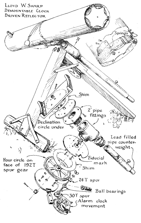 The main supporting leg is a lightweight box of 24-gauge sheet steel. "Practically everything that comes apart on this instrument comes out of a slot," Sharp says, referring to the braces attached to the leg which have "slightly angled, snugging-up slots that drop over studs and are held in place by gravity." He adds that "although my telescope, which I call 'Portable Pete,' smacks of baling wire in spots, it performs beyond my fondest hopes." This is a telescope that could be made by a beginner, yet it contains luxuries. The driving-gear train between the clock and the telescope is simple. The wheel that drives the minute hand of the clock, turning at the rate of l0 teeth an hour, meshes with a 30-tooth spur gear on the ball-bearing jackshaft, which is thus driven at the rate of one revolution every three hours. A 24-tooth gear on the upper end of the shaft then drives a six-inch, 192-tooth gear on the right ascension axis at the rate of once every 24 hours, a solar day. Corrected speed for the sidereal day of 23 hours, 56 minutes, 4.09 seconds is obtained, or rather approximated, by adjusting the speed of the clock. The gears are numbers G174, 171 and 189, obtained from the Boston Gear Works of Quincy (not Boston ), Mass., and their cost was $4.30. The pipe fittings used on the declination axis-floor flange, T, and reducing bushing-are a full two-inch size. "This is clearly a poor man's telescope," Sharp writes, "though not 'cheap.' Slight imperfections of the gear teeth will cause slight hour-angle variations, producing oblong star images if celestial photography is attempted. Even in this respect the drive will serve for all except ultra-microscopic results, but its main purpose is as a luxury during ordinary visual observation, to keep the heavenly bodies from crawling out of the field of view because of the earth's rotation as soon as they are located. If the telescope is used as a camera, precise alignment of the polar axis with the earth's axis will be as important as correct clock rate, and this cannot be accomplished in a hurried assembly. "Ball bearings on the jackshaft and ball-bearing rollers under the right ascension base plate reduce the friction so that the clock is strong enough to drive the telescope. If the clock used is not strong enough, the addition of a spring-loaded sector that can be cocked will supply enough torque for an entire evening, the clock then serving largely as a time control. "While the hour circle may be inscribed on the 192-tooth gear, this is perhaps superfluous, since the gear has 8 teeth per hour as a sufficient guide. "Both right ascension and declination bearings are of the disk type with annular contact and shims of 0.01-inch sheet metal. The disk-type bearing is unequaled for ease of fabrication and smoothness of operation. It combines maximum steadiness with minimum frictional overshoot, an annoying characteristic of hand-powered telescopes resulting from spring in the mounting combined with high static friction. When the object is not centered well enough in the field of view of such a telescope, the observer pulls the telescope to center it. On the first pull nothing happens, so he pulls harder. Suddenly static friction is overcome and the telescope moves too far. Well-lubricated bearings of large radius and area greatly reduce this overshoot." By loosening and reclamping the wing nut on the jackshaft, the user of the Sharp telescope can employ the convenient slip-ring principle described by Russell Porter in his chapter on the design of mountings in Amateur Telescope Making. This method enables the observer to "bring any bright known star into the center of the telescope field and set the circle to that star's right ascension, taken from the ephemeris," thus freeing himself from unnecessary drudgery for the entire evening of use. The six-inch mirror is mounted in a generous seven-inch tube. The cell, made of aluminum, has no rear-end protuberances. Its little central hole assists in lining up the prism. When Sharp was invited, as other workers are, to criticize his own telescope by pointing out spots he might improve if he were building it again, he listed the tube-clamping strap with spring catch, which permits the tube to rotate for the most convenient eye positions in only one direction, but snubs it in reverse; a tendency of the jackshaft wing nut to work loose; and the absence of a declination lock. Such self-criticisms are useful to other builders. They underscore the often-given advice that the beginner, instead of attempting to make the final large and perfect telescope on his maiden effort, should approach it by building a series of instruments, perhaps one a year, in the course of which many of the things that "would be done another way another time" are certain to be found.