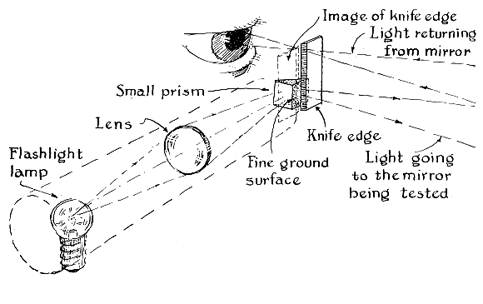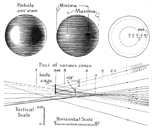 "If the mirror being tested were the usual 6-inch with 48-inch focal length, the smallest pinhole which should b used would be .0015-inch. A focogram with a .001-inch pinhole would have the same appearance as the .004-inch pin hole in the illustration. "There is no good reason for striving for a tiny pinhole, since the cutoff is really formed between the knife-edge and the image of only one side of the pinhole. In fact the pinhole may be dispensed with altogether and a single knife-edge used for both the defining edge of the light source and the cutoff. At one point it forms a boundary of the light source and at another it intercepts its own reflected image. This arrangement is also much easier to clean than a pinhole." Since the lamp and knife-edge move toward or away from the mirror as a unit, r2/2R is used in place of r2/R.