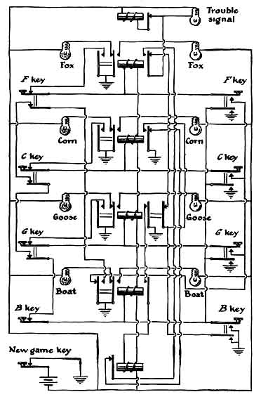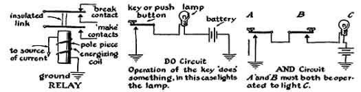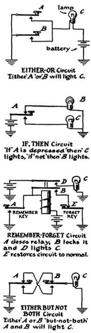 "A lot of people will tell you that machines can't think," Bezold said, "and perhaps they are correct. But it seems to me it is largely a matter of what you mean by the word 'thinking.' Some of the purists say that if a machine can do it, you can't call it thinking. Whether it is thinking or not, I have made several machines which do a number of things that human beings do with their brains, and so have many other amateurs. My little machines take in information, remember it, pass judgment, make decisions, reach conclusions and take action. If the gadget I'm working on now pans out, it will play a game with you that is similar to the old match game of 'nim.' As it goes along, this machine will learn from experience to become a better player. It may make a mistake when it begins to play, but it will remember every error and will never pull the same boner again. I'll admit that all of the 'intelligence' exhibited by these devices must be designed into them, and that the little ones I have built are pretty stupid. But in certain ways a mouse can be smarter than a man-and this is so with some of these gadgets." Bezold's nim-playing machine consists of a metal box three feet tall, two feet wide and about a foot thick, housing some 50 relays and accessory apparatus. The front holds three groups of signal lamps with associated push buttons. When the machine is turned on, all lamps light. The player can extinguish lamps by pressing the push buttons. A switch starts the game and tells the machine who gets the first play-itself or the human player. According to the rule, each player in turn may put out as many lights as he wishes in any one of the three groups. The one who puts out the last light wins. As the machine is now constructed, the human player can win if, and only if, he makes the first move and plays a perfect game. Bezold hopes to endow the machine with a touch of human frailty by combining some new relays and associated circuits with those already in the gadget. After this modification the machine will forget all the strategy it knows each time the main switch is turned off. It will then begin competition on an equal footing with inexperienced human players. But the human beginner will have to keep his wits about him and remember perfectly everything he learns, for the machine will catch on quickly and never fall victim twice to the same line of opposing play. As Bezold points out, you do not have to be an electrical wizard to build these machines, nor do you need any mathematics beyond arithmetic. It helps a lot if you enjoy puzzles, and a knowledge of circuit symbols is handy. You can memorize the symbols in a few minutes. Perhaps the most novel idea the beginner will encounter is the use of switches relays, lamps and other circuit elements to express words and logical relationships. The two positions of a simple switch, for example, can mean more than "on" and "off." They can also symbolize yes or no, true or false, or the digits 1 or 0. A relay is not much more than a glorified switch, operated electrically. One part consists of a bar of soft iron surrounded by a coil of insulated wire [see Fig. 1 at left]. When current flows through the coil, the bar becomes a magnet which attracts a similar bar called the armature. The motion of the armature is transmitted through insulators to one or more flat springs that carry contact points. These serve as switches. Current flows through the relay's coil the contact springs are flexed by the armature, and so the switch is operated. When the current stops, everything snaps back to normal. Offhand it may seem that putting a relay in a circuit is the hard way to go about flipping a switch. But in thinking machines most of the switches must flip automatically, usually by current flowing through other switches also operating automatically. Thus one or more input pulses can proceed through complex networks of relays as a spreading chain reaction, modified or conditioned en route according to the requirements of the designer. This, incidentally, is the way the human brain works, with the neurons acting much like relays. In thinking machines the end of the reaction is always the same: an output circuit closes or opens, thus lighting a lamp or putting it out, starting or stopping a motor, or causing some other registering device to work. Essentially the reaction consists in the manipulation of logical relationships. Thus far Bezold has used only five basic circuits in variations and combinations. With these five, he says, an amateur can build automatic devices to solve any puzzle that can be stated precisely in words. In addition to the simple "yes-no" circuit, the designer will need one expressing an "and" relationship. Such a circuit consists of two switches connected in series so that current must flow through first one, then the other to effect closure. The circuit is completed when both switch A and switch B are operated [see diagram at the right of Fig. 1]. Equally useful is the "or" circuit. This has two switches connected in parallel so that operation of either one permits current to flow. Closing switch A or switch B makes the connection [see top diagram Fig. 2]. The fourth basic circuit expresses the logical relationship of "if, then" [second diagram Fig 2]. It requires a two-way or transfer switch in which the switch blade operates between two contacts, connecting with one in the "on" position and with the other in the "off" position. The first of these is called the "make" contact and closes when the switch is operated. The second is called the "break" or "back" contact, and it passes current until the switch operates, when it opens or breaks the circuit. Relays can be equipped with several sets of contact springs of both kinds. By connecting the make and break contacts of one relay to the switch arms of following relays, the designer can build up a branching pyramid of transfer circuits. With only five relays, for example, such a "transf