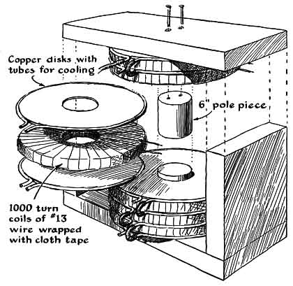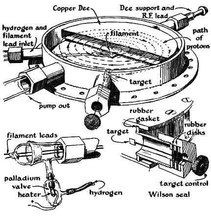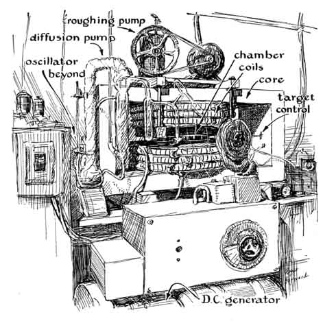 Similar gangs, many unknown to the police, are at work all over the country. The gang movement in amateur science appears to be growing, perhaps as a result of rising costs and the increasing complexity of scientific experiments. A worthwhile wind tunnel or a radiocarbon dating apparatus cannot be financed b the proceeds from a youngster's odd jobs. Hence the boys are learning to pool their resources. The combined pocketbooks, enthusiasm, energy and audacity of half a dozen youngsters seem to be equal to just about any project modern science has to offer. This includes even a cyclotron. A group of teen-agers in El Cerrito, Calif., decided to have one although they knew that even a small cyclotron may cost tens of thousands of dollars and require such finicky adjustments that nuclear physicists sometimes spend months getting the bugs out of it. The boys, lacking the mature judgment that so often prevents adults from having fun, built their cyclotron largely out of junk parts, and it worked fine! The following account of how they did the job is by Richard C. Sinnott, a member of the group who subsequently majored in engineering physics at the University of California. "The nucleus of the idea of the El Cerrito cyclotron, like so many nuclei, was not well defined at the beginning. Lee Danner, Charles Williams, Karl Zellmann and I were all in the same physics course at El Cerrito High. Our physics teacher, Benjamin Siegel, had encouraged us in many outside projects. We worked first on a wind tunnel, then on a Tesla coil. When these projects were completed, we felt that bigger and better things should be tried. Since E1 Cerrito is close to Berkeley, we gradually developed the idea of trying a cyclotron. During a tour of the cyclotron at the University of California Radiation Laboratory we met Louis Wouters, who became our consultant and advisor. "Many people thought that the idea of high school students building a cyclotron was ridiculous. Others, like Dr. Siegel and Dr. Wouters, encouraged our project. Looking for a sponsor, we had a talk with Frank Schallenberger, principal of E1 Cerrito High School, and he sent us with a warm recommendation to the Superintendent of Schools, Walter T. Helms. Mr. Helms set up an account for us. The cooperation of these men will always shine as an example, to me, of the attitude of true educators. They did not discourage us nor doubt our sincerity; they assisted us as best they could, both morally and financially, and the complex project of building a cyclotron was launched with great enthusiasm and great hopes by four very young fellows. "Let us deviate now to the more scientific aspects of the cyclotron. The operation of a particle accelerator is analogous to that of a gun. When a bullet is fired, the powder accelerates the lead slug, the barrel constrains the missile and directs it in a given path. In a cyclotron the bullet is a proton, and the constraining "barrel" is the magnetic field. The propulsive force is a high-voltage, high-frequency potential which accelerates the proton. The path of this bullet, however, is not straight but circular. "The particle starts at the center of an evacuated circular chamber. Within the chamber a flat, hollow electrode in the shape of a half circle, the 'dee,' applies the high-frequency alternating voltage that drives the proton. Professional cyclotrons usually have two dees; ours has only one. A strong magnetic field, acting perpendicularly to the plane of this flat dee, forces the particle into a circular path, which actually becomes a -spiral path as the particle flies in wider and wider circles. "Since a proton is a positively charged particle, it is attracted by negative charge. When the rapidly alternating voltage of the dee is negative, it attracts the proton into its hollow interior. While the proton is traveling through its half-circular path, the accelerating voltage on the dee is changing its sign. As the particle leaves, it is given a kick by the now positive electrode. The relationship between the magnetic field shaping the particle's path and the frequency of the high voltage is carefully chosen so that the particle keeps getting a kick each time it enters or leaves the dee. In the half-circle of the vacuum chamber that has no dee, it travels by inertia, still under control of the magnetic field. As its velocity increases, centrifugal force causes the particle to transverse a path of ever-increasing radius. At the end of this dizzy trip the proton collides with the target-a small plate made of the substance to be bombarded. The interaction of the accelerated protons with the matter of the target is then studied by various methods to solve riddles of nuclear physics. "The machine can be broken down into these major parts: (1) The magnet and its power supply; (2) the electrical oscillator and its power supply; (3) the vacuum system; (4) the chamber in which the acceleration takes place; (5) miscellaneous power supplies, metering and control circuits, and so on. The construction of the machine more or less followed this sequence. Our first problem, therefore, was the magnet. "The core of the magnet weighed about 1,000 pounds. We thought it would be ideal to make the core out of Norwegian soft iron, but it turned out that none was available at the time, so mild steel was used. The biggest problem with the core was machining. The tools in the shop at El Cerrito were not large enough, and the cost of having a commercial machine shop do the work was prohibitive. After much inquiry we found that the Central Trade School in Oakland would do the work free. The School had the facilities, and since the work had educational value for their students, they agreed to do it for us if we supplied the metal. "Magnet wire was the next problem. At the time copper wire was scarce. We managed, however, to get about 800 pounds of No. 13 magnet wire. While the core was being machined, we wound six coils in the shop at El Cerrito H