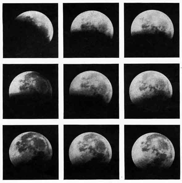 THE LUNAR eclipse of January 29-30, 1953 gave Apollo Taleporos, an electronics engineer on the staff of the Columbia Broadcasting System, a chance to see how effectively such an event can be photographed with simple equipment. His six-inch Newtonian reflector, which has a focal length of 42 inches, was mounted on a tripod and the camera, a 35-millimeter, single-lens reflex, was held bi hamd in front of the 1-1/4 inch eyepiece. The condition of the sky was approximately .7, which means that stars of the fifth magnitude could be seen near the zenith. Except for scattered clouds, the night was cold and clear. All exposures were made with the cameraq stop set at f/3.5 and the film was Super XX panochromatic. Although in New York City, where the pictures were made, the moon entered the penumbra at 3:40.1, clouds prevented the start of photography until just after the end of totality at 7:29.1. The first three exposures were made at 1/25 second, the next two at 1/50 and the remaining four at 1/150. According to Talepros the principal difficulty facing beginners in lunar photography is that of learning the proper exposure time and aperature setting. He solved this problem in advance of the eclipse by making a series of exposures each night as the moon grew from new to full, and keeping careful records of the results.