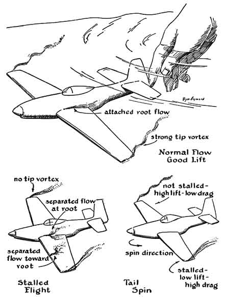 In the U. S. there are now some 100,000 enthusiasts who build and fly miniature aircraft. The group includes commercial airline pilots as well as cub scouts. Needless to say, these hobbyists wish they could find some way to test their designs scientifically and inexpensively beforehand to cut down the high accident rate when they submit their craft to the hazard of flight. Discussing the techniques of aerodynamic research, a famous airplane designer once said: "If we could only see the splash, our troubles would end!" George Davis, an aeronautical engineer of Teaneck, N. J., recently made a related comment: "If someone hit on the secret of keeping models within arm's reach during test flights, I would pay him a million dollars for exclusive rights to the idea!" David Raspet, a 13-year-old amateur of State College, Miss., thinks he has the answerand would like Davis' address. His method? Fly the models in a water model of the air! By using water he compresses the scale: miles per hour become inches per second, and the geometry of the flying field shrinks to the proportions of the family bathtub. It may be argued that data derived from hydrodynamics do not necessarily hold for aerodynamics. Within limits the argument has substance. Still, our knowledge of the laws of streamline flow obeyed by aircraft is based in part on the hydraulic studies of the 18th-century Swiss mathematician Daniel Bernoulli. Lessons learned in the bathtub actually can be applied to the design of a model plane. David permitted his father, August Raspet, of the Aerophysics Department at Mississippi State College, to assist in working out the details of his experimental procedures. They make the following joint report: "During a reluctant session in the bathtub one wintry Saturday evening the senior author of this account (the son) happened to find a small plastic airplane model beside the tub. It seemed more interesting than the brush and soap, and he occupied himself with certain experiments. While attempting to sail the plane under water, he noticed that it stalled from a normal glide. To improve its balance he trimmed the model with a few tacks stuck with soap into the nose. The result was a surprisingly good slow-speed glide. "Interestingly enough, this kind of underwater experiment provides a good study of slow-speed motions of airplanes. After many such fascinating experiments, the senior author and his father (the junior author) decided to write this article and thereby communicate the pleasure to their fellow enthusiasts of aviation. "The nice thing about the technique that will be described is the ease with which it may be carried out. The very elegantly molded plastic models, usually only something to look at, can actually be made to fly without a motorunder water. These flights are reasonably similar to real flights in the air in that they show stalls, spins, pitching on the nose and whip stalls. All this can be observed in slow motion without expensive high-speed motion picture photography. Measurements of glide angle and flying speed can easily be made. In addition it is possible to study the nature of the boundary layer (the thin layer of air that surrounds the surface of the whole plane) and of the wing-tip vortex, and to investigate the influence of stall on the tip vortex and the nature of wing-root interference. In other words, here is an entertaining and instructive technique which requires only a simple plastic model and a bathtub. If you don't have a bathtub, go to your local swimming pool or to a pond and conduct your underwater aerodynamics there. "You can buy a cheap plastic model for 10 cents at most dime stores. We have used the Spitfire and P-40 of this type. The wing span of the models is four inches. Next in size and price come such models as Olin's Howard Pete or Mooney Mite, which has a span of 6-1/2 inches and sells for 25 cents. In the more realistic class are the F-51 made by Hawk, a model of 9-1/2 inch span, and the Grumman F9F and the 10-inch F-90, both made by Aurora. All of these models cost less than a dollar. "For those fortunate enough to have war-surplus recognition models, we suggest the Gotha 242 glider as an ideal performer. It has a 13-1/4 inch span and is a little big for the average bathtub, but it would be a fine size for a swimming pool. These recognition models sold for several dollars. In the field of exact-scale plastic models the Allyn models are excellent. Their prices run from $1.79 to $2.79. "The 10-cent models require only a little weight added to the nose to achieve stable flight. We used one or two small tacks stuck into soft soap molded into the open bottom of the nose to get balance on these models. "Most of the more expensive plastic jobs have hollow fuselages which must be filled with water. You must make sure that there are no air bubbles inside the model for bubbles will move back and forth as the model pitches, thereby changing the center of gravity and affecting the stability as badly as shifting ballast will in a large airplane. Quite a few test pilots have met with accidents due to shifting ballast. "When the model is completely free of bubbles, it can be 'flown' in the tub and its trim can be checked. Usually a little lead or a nail is needed in the nose or spinner to get longitudinal balance. The model will behave exactly as models in the air except that the flight will be very slow. If the model pitches its nose up and stalls, more weight is needed in the nose. When correct balance is obtained, a smooth, straight flight results. "On jet-type models the jet intakes need not be closed for when the model is filled with water the water merely flows through the jets at slow speed. "On the recognition models it may be necessary to drill two holes (at the top and bottom of the fuselage) to be sure of filling the fuselage with water. You can make tests at different wing loadings: for a low wing loading fill the fuselage with wax; for a heavier loading, 