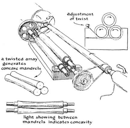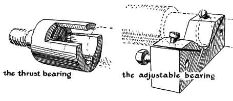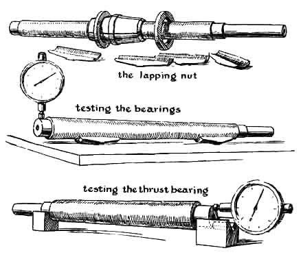 Several months ago Roger Hayward, the versatile illustrator of this department, mentioned that he had recently built a traveling microscope and wondered if it might not hold some interest for the amateur fraternity. "This device," he wrote, "affords one of the nicest ways of measuring lengths of a few inches that I know about. The traveling microscope is just what the name implies: a microscope mounted on a carriage moved by a screw through a measured distance. "The design of the carriage and its driving mechanism is much the same as the design of a ruling engine-but without the requirement of millionth-inch precision. At the outset let it be said that this is my first traveling microscope and I have no illusions about its perfection. Use has demonstrated that the frame could have been a bit heavier; the thrust bearing is suspect, and the ways could have been sturdier. Nevertheless, building it was fun, and no gadget in my shop has proved more useful. "The project was really undertaken to try out a method of grinding the ways. After I had proved the method, it seemed rather a waste o$ time and energy not to complete the instrument. I haven't the foggiest idea of what the pitch of the screw is, and I have never been curious enough to lay hands on a standard to find out. In spite of these shortcomings the machine is capable of a precision of one part in 60,000 over a range of six inches, and with this accuracy it is possible to make fair measurements of coefficients of expansion, shrinkage of concrete and other physical properties. "I have also made a carriage attachment which can rule scales; in fact, I used it to rule the scale of the instrument itself. A number of linear scales have been ruled with one thousandth of an inch spacing, and once I ruled a bit of grating. The rulings were half an inch long and spaced five 10,000ths of an inch apart. An indication of the instrument's precision is given by the fact that the two yellow lines of mercury are clearly resolved by this miniature grating-but the sodium lines are not. "The traveling microscope consists of six major components: the carriage ways, the screw, bearings for the screw, the nut, the carriage and the microscope. "The steel ways and spacer for the end plate are made from three pieces of 3/4-inch stock about 10 inches long. It is important that the carriage move in a straight line without rotation, because often you want to measure objects a foot or more away. On one occasion, for example, I measured the coefficient of expansion of Lucite while the sample was in an electric furnace. The measurements were taken through small windows. In such situations the mandrels (bars) that serve as ways obviously must be straight, although they need not be round. "It occurred to me that the necessary straightness could be generated by the primitive method of wet-grinding three mandrels together in a manner analogous to the making of three flats. This time-honored method depends on the fact that if any three surfaces make perfect contact when tried in all possible combinations, all must be plane. In the case of mandrels, the method has the attractive feature that the three can be ground together in one continuous operation. The method will not assure roundness, but this is not a requirement of the ways. The sketch to the left shows the setup. "It is apparent that two cylinders can lie in contact with each other along their whole length if one is barrel-shaped and the other spool-shaped. A third cylinder could not lie in contact with this pair, however. In the grinding setup it would abrade the center of the barrel-shaped member and the ends of the other. If an array of three stacked cylinders is twisted slightly, a fit is possible if all taper from the ends to thinner waists in the middle. This condition can be tested by holding two cylinders in contact up to the light. If a position can be found where light can be observed between them, then the mandrels are concave and the array was twisted during grinding. A slight adjustment of the end bearings of the grinding fixture will correct the matter. "A few evenings of grinding produced quite acceptable cylinders. The design of the bedplate and bearings of the grinding fixture is apparent in the illustration. By making the pulleys of the two lower mandrels of different sizes, I was able to get each of the three mandrels to grind on the others when they turned. The upper mandrel runs free, and grinding pressure is supplied by its weight. The assembly is belted to a rod chucked between centers in the lathe as shown. The mandrels are identical. Symmetry can therefore be maintained by exchanging and reversing the individual pieces frequently during the grinding operation. "Separate stock is used for the screw. The ground mandrels become contaminated with carborundum, which would dull the thread-cutting tool. The screw stock is chucked between centers and carefully trued. I cut 40 threads per inch and, to assure a screw of top quality, took many fine shavings. It is desirable ~ that each cut proceed from end to end e without any interruption to sharpen tools, so that you do not have to pick up a cut in the middle of the screw. The cuts vary in depth from five thousandths to five 10,000ths of an inch. The two sides of the thread are cut with the mandrel turned end for end. This distributes errors of run which might otherwise be transmitted to the work by the lead screw of the lathe. "A steel nut about three inches long [top of illustration at right] was split into four segments and used to lap the thread. As the lapping proceeded, the segments of the nut were frequently turned end for end. Measurements of the diameter of the screw (with wires and a micrometer caliper) and the disappearance of dark rings during the process of lapping were taken to indicate that a fair precision was being achieved. The outside of the nut was tapered so that steel rings could be slipped on to hold the nut segments togethe