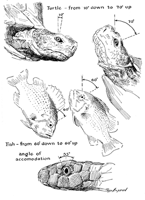 "If I remember Norbert Wiener's book Cybernetics correctly, he had a lot to say about the terrifyingly complicated apparatus that translates an image on the retina into the code of memory. Among the many transformations that signals from the retina have to undergo before they find and are matched with their twins in the memory (that is, for recognition to take place) is a step which, in effect, levels these signals regardless of the angle at which we hold our eyes. "Since the copperhead needs gyro-controlled eyeballs, this species of snake must lack at least this one processing apparatus in the signal's path from the retina to the memory. "It seems to me that this would represent a major design difference between the brain of the copperhead and that of animals with eyes which make no provision for perpendicularity control. Certainly you would not expect a difference of this magnitude among closely related species. Consequently other snakes must have the same eyeball control. "Could it be that this characteristic has escaped observation because it is much harder to detect in the case of eyes with round pupils? If this suspicion makes any sense to you, why not ask one of our herpetological friends to attach or paint little markers on the pupils of other snake species and take a look?" Munro reported that he had already examined snakes with elliptical pupils. "Without exception," he wrote, "the eye keeps its vertical position when the snake tilts its head. This observation, incidentally, casts some doubt on my original supposition that the eye accommodation evolved in pit vipers is an essential for accurate striking. Snakes that do not strike also have the gyro-control. Incidentally, you cannot attach markers to the eyeball of a snake for observing eye movements. The eyeball is protected by an immovable window, part of the snake's skin, which is cast when it sheds." "I could not shake off the suspicion," Morgenroth went on, "that if snakes lack one or possibly more of the major complications in the picture-recognizing department of the brain, this deficiency and consequently the copperhead's 'crutch' of a gyro-controlled pupil must also exist in animals farther down the evolutionary ladder, including fish. It is just not conceivable that snakes should be distinguished from all other members of the animal kingdom by such an extraordinarily special brain design. Yet it is not easy to suppose that such a thing should have escaped notice. "It should be said that today's snakes are a fairly recent product of evolution. Historical geologists tell us that during a long dry period some millions of years ago the snake's ancestors burrowed underground to escape extinction and that their eyes retrogressed to barely more than light-sensitive buds. When life on the surface became possible for them again, they faced the necessity of reinventing the eye. Hence in many details of design snakes' eyes are unique. Nevertheless it seems reasonable to suppose that the limited brain mechanism which requires a gyro-eye might be shared by some of the snake's evolutionary kinfolk. "With the objective of locating one of these, I undertook a scientific expedition to the goldfish tank at a local five-and-ten-cent store. Quite a number of these little fish, I discovered, carry spots on the periphery of the pupil which are easy to watch as the fish gazes at you while swimming up and down the glass wall of the aquarium. After watching them for a while I saw that, sure enough, the fish eyeball always kept the same position relative to a vertical line regardless of whether the fish pointed its nose 60 degrees up or 60 degrees down. "Then I invested 5O cents in a baby turtle, selecting one with two little black stripes on the tissue surrounding the pupil. I found that the turtle's eye moves in precisely the same way as the copperhead eye illustrated in your March issue! The maximum angle of turning down, as the head points up, appears to be about 70 degrees. As the head is turned down, a limit is reached at about 10 degrees. If the animal is tilted farther down, it compensates by raising its entire head. The eyes seem unable to follow a sudden tilting. The lids close for about a second, as if the unanalyzable image has to be excluded until the eyes level off. "It seems just not possible that all this has never been discovered before. Was Dr. Munro's observation really a scoop? If it was, and if what I have just reported has not been known, then I hereby lay claim to being the first man who ever really looked a fish straight in the eye!" Before conceding that distinction to Morgenroth, it seemed appropriate to consult a professional biologist and learn just who was scooping whom. Charles M. Bogert, curator of amphibians and reptiles at the American Museum of Natural History, decided that Munro's report on the copperhead's eye movements was in fact a scoop, though a San Diego herpetologist had once noticed, but not published, such movements in rattlesnakes. Morgenroth, however, "is not the first man to look a fish straight in the eye," says Bogert. A number of ichthyologists have noted "wheel" movements in fishes' eyes. But they have not gone much further than merely to note the phenomenon; there has been little or no attempt to explain it. Morgenroth, though a little disappointed to learn that the discovery is not new, makes bold to offer some conjectures as to why fishes and reptiles have gyro-controlled eyes. "First," he writes, "let us agree on some terminology. We'll distinguish between eyeballs with two degrees of freedom (2F) and eyeballs with three degrees of freedom (3F). Offhand, it might appear that an animal with 3F eyes would require no level-correcting beyond that afforded by the eyeballs themselves, whereas animals with 2F eyes must accomplish this level-correcting somewhere in the visual cortex. "Now let's see how this internal level-correcting works in an animal with 2F eyes, such as the human animal. When yo