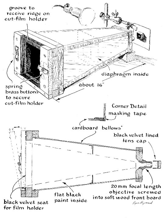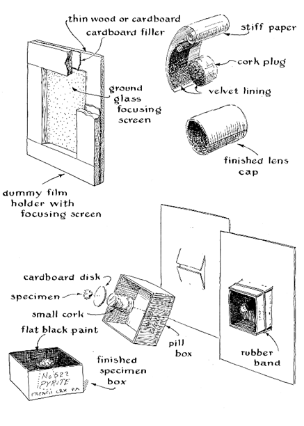 "In constructing the camera do not fail to include the rectangular diaphragm shown in the center of the lens extension. It protects the negative from light reflected by the walls, which may amount to as much as 4 per cent at grazing incidence, even though the interior is finished in flat black. Bellows-type cameras do not need diaphragms, because the corrugations deflect the incident rays. Make certain, also, that the frosted surface of the ground glass is in the same plane, relative to the plateholder, as that normally occupied by the emulsion. If this precaution is not observed, the pictures will be out of focus. Focusing, incidentally, is accomplished by sliding the specimen toward or away from the objective. "A bound set of color prints of your collection will multiply its usefulness. On the back of each photograph you should write the name of the mineral, the crystal class to which it belongs and notes on its environment, physical properties, composition, distinguishing characteristics and tests. The set will make an invaluable supplement to conventional field guides, such as Edward Dana's Minerals and How to Study Them and Frederick Pough's A Field Guide to Rocks and Minerals. It will also save time by enabling you to make a quick check of some detail without disturbing the collection. "In the course of building up a collection of micromounts and identifying specimens, a beginner will discover many fascinating table-top tests. Some minerals, such as crystallized quartz and tourmaline, are piezoelectric: they develop electrical charges on opposite crystal faces when subjected to stress applied either mechanically or by unequal heating. If such crystals are dusted with a mixture of finely powdered red lead and sulfur forced through a silk screen by a blast of air, the particles will separate and settle on the charged faces, the sulfur clinging to the positive face and the red lead to the negative. During the momentary frictional contact between the silk and the powder, the silk has robbed the red lead of some of its electrons and has given up electrons to the sulfur. Thus the two kinds of powder take on charges of opposite polarity. A homemade bellows closed by two thicknesses of silk stocking makes a convenient duster. "Other interesting tests make use of the property known as fluorescence. Certain minerals, when viewed under ultraviolet light, glow with characteristic color. Inexpensive lamp bulbs designed especially for emitting ultraviolet light are now available from dealers in electrical supplies. Reference texts written for amateur mineralogists describe many other tests, including those for hardness, chemical behavior, radioactivity and similar identifying characteristics, which will keep an amateur busy for a lifetime even if he limits his prospecting to pebbles found in his own block." In his article on making a microscope, in this department for June, 1954, Kenneth Uitti asked for a simple home method of anodizing aluminum for black optical goods. A. F. Stalcup, an amateur microscope and telescope maker of Clinton, Iowa, recommends the following technique: "The only critical requirement in this process is cleanliness. The parts to be anodized must be scrupulously clean, as well as the aluminum conductors leading to the anodizing cell and all vessels used for mixing and storing solutions. Whenever possible, polish the work with No. 400 sandpaper, crocus cloth or a high-speed buff charged with polishing compound. Remove all grease, cutting oils, tool coolants and the like. "The following equipment should be set up in advance so that you can plunge the work into the bath as quickly as possible after polishing while the surfaces are fresh and uncontaminated. This helps to assure a uniform coating of oxide during the anodizing process. "The anodizing cell must be made of a substance which will not react with the solution. It can be an old battery jar, large fishbowl, glazed stoneware crock or similar container. It must be large enough so that the work can be immersed completely. "The cell is filled with a 4 to 6 per cent solution of sulfuric acid. This concentration is not critical. Remember to exercise due precaution. Add the acid to the water, never the water to the acid! Next, connect the work to the anode or positive side of a six-volt storage batter by means of an aluminum conductor. Aluminum clothesline will do, but polish it before you use it. The negative side of the battery is similarly connected by a aluminum conductor to a piece of the purest aluminum available. A large sheet of aluminum kitchen foil will work, but be sure to double it several times to give it strength. Then clamp the foil to the conductor tightly to assure a good electrical connection. The cathode area should be equal to or larger than the area of the work. Remember that you must not permit any metal other than aluminum to make contact with the sulfuric acid solution. "The work and cathode are now plunged into the solution and permitted to anodize for about 30 minutes. The time is not critical. Be sure the work and cathode do not make contact in the cell, for that would short-circuit the battery. "In the meantime bring a solution of black Diamond or Rit dye to a boil. One 25-cent package of dye to three quarts of water is about right for pieces the size of a microscope barrel. "At the end of the anodizing period remove the work from the anodizing solution, pass it under a stream of filtered tap water and immediately plunge it into the boiling solution of dye. Work as quickly as possible. Let the part remain in the boiling dye for about 30 minutes. Upon removal from the solution, the part will present a sickly gray appearance, but don't become alarmed. As soon as it is cool to the touch, wash off the surplus dye and rub the work down with a soft cloth. It will be blacker than a stack of black cats at midnight! Do not attempt to give a polish to any surfaces that may be critical with respect to reflec
