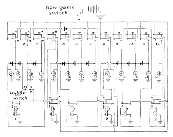 "Each group of four lamps is controlled by a circuit identical with the others. The diagram here denotes by the letters A and B some of the possible opening moves. Consider first a game in which the machine wins. The toggle switch has been thrown to position A, indicating that the machine's opponent moves first. He can put out one, two or three lamps by operating the first, second or third key, respectively. Contact spring A on the operated key transmits an impulse to relay 1 (associated with group 1 ) . The relay locks down, because its winding receives power through the lower contact from its spring ( connected to the battery through the upper contact and spring of relay 2 of group 1). This cuts off power to some of the lamps in the first group of four. The lamp associated with the key and those to its left will go out-but not those to the right of the key. Observe that 'but-not' elements ( diodes ) are inserted between each pair of lamps in each group. Contact B of the key now transmits power to the lamps at the right of the key but not to those at its left. This completes the opponent's play He now releases the key-which initiates the machine's play. Contact B opens, cutting off power from the alternate 'but-not' circuit to all remaining lamps of the group. This registers the machine's move. "Now consider a game in which the machine has the losing side. The toggle switch is operated to position B. This cuts off power to the first two lamps and constitutes the machine's first move. The opponent gains the advantage by depressing key 4 and thus extinguishing the remaining lamps in this group. The contact spring A on this key transmits an impulse to the winding of relay 2 in group 1, and the relay locks down through its bottom contact (by means of power supplied through spring B). Spring B of relay 2 acts as an 'either-or' element, supplying power either to the first group of four lamps or to its lockdown contact. This prevents power from entering the first group of lamps for the remainder of the game. Spring A on relay 2 cuts out the first lamp in the second group of four. Contact B on key 4 continues to supply this lamp with power, however, until the key is released. The machine could be designed so that this play would put out either the first, second or third lamps of group 2. It could not, however, capture the advantage by any of these plays. Hence in the interest of keeping the circuit as simple as possible I confined the machine's choice of play to the first lamp. This tactic also gives the opponent the maximum choice of plays-and the maximum opportunity for making an error! The opponent can now preserve his advantage by operating key 8. This extinguishes the remaining lamps in the second group. The machine will reply by putting out lamp 9. The opponent then operates key 12, putting out the remaining lamps in the final group and forcing the machine to lose by putting out lamp 13. None of my friends has yet discovered the simple winning strategy of this game, although a few have won by accident.