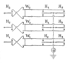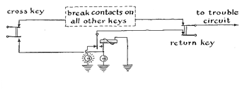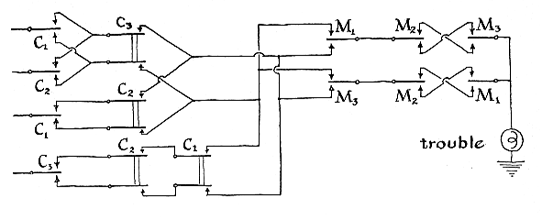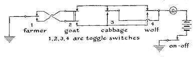 "My second machine was designed ' around a simple ancient puzzle of the permutational variety. This puzzle generally takes the form of confronting a person with the problem of ferrying himself and his possessions across a river under frustrating circumstances. Its original author is supposed to have been the 8th-century scholar Alcuin, a friend of Charlemagne. "Take the case of the farmer who wants to ferry a wolf, a goat and a head of cabbage across a river in a small boat which can hold only himself and one of his possessions. For obvious reasons, he ' must never leave the wolf and the goat alone, or the goat and the cabbage alone. The problem involves three key words: 'either,' 'and' and 'or.' We can symbolize the conditions of the puzzle by a circuit with four toggle switches [see diagram at top of the next page]. Analysis of the puzzle shows that a trouble situation occurs when the farmer is on the opposite side from the goat and either the wolf or the cabbage is on the same side as the goat. The function of the machine is to signal trouble (by flashing a light) so that the player can switch it off and start again; he wins if he gets all four items across the river without a 'trouble' signal. "This pircuit is a nice project for the beginner, because it can be wired up in a single evening from materials that cost less than $5 if purchased new and as little as 75 cents on the war-surplus market. The circuitry for the puzzle was fully described and discussed in this department in the issue of May, 1953. "In the 16th century Niccolo Tartaglia, the Italian mathematician and inventor, suggested a somewhat more elaborate version of the same puzzle. Three lovely brides and their jealous husbands must cross the proverbial river in the small boat, holding only two people. Each husband insists that the crossing must be so arranged that his wife is never in the company of another man unless he, the husband, also is present. "A circuit representing this situation is developed by following the same elementary rules of symbolic logic as in the simpler farmer problem. Your friends will find the machine more interesting if you install signal lamps to indicate the location of each character as play progresses. A convenient circuit for accomplishing this employs a relay equipped with front and back contacts (an 'either-or' arrangement) and a pair of double-pole, single-throw keys. This 'transfer' circuit is identical for all characters in this as well as in other puzzles. The diagram at the bottom of the next page shows the circuit for one character. All the contact springs are assumed to be connected to the battery unless otherwise indicated. Operation of the 'cross' key closes the bottom contact of the relay and thus energizes the relay's coil. The armature accordingly locks down through the bottom contact of the 'return' key. In effect the arrangement constitutes a memory circuit and relieves the player of the need to keep account of his moves or reconstruct them by inspecting the position of the toggle switches (or relays, whichever are used for constructing the trouble circuit). Operation of the return key releases the memory relay. The 'break' contacts of all keys are wired in series and supply power to the trouble circuit. When the player wishes to send a pair of characters across the river, he operates the key representing one character and, before releasing it, operates the other key. Power is thus prevented from entering the trouble circuit until the move is completed. "As in the farmer problem, the trouble signal operates whenever any husband is on the opposite side of the river from his wife and she is in the presence of either or both of the other husbands. The trouble circuit is shown at the bottom of the opposite page. Although the diagram omits mechanical linkages, it is understood that all the switches associated with the same character, H1, for example, operate in unison and in the same direction. They may be linked mechanically (toggle switches) or electromagnetically relays. For simplicity relay coils have been omitted from the diagram of the trouble circuit. "In a still more complex version of this puzzle, the husbands and wives become missionaries and cannibals-three of each. Same river, same two-passenger boat. All the missionaries can row. Only one cannibal can row. If the cannibals on either side of the river outnumber the missionaries at any time- into the stewpot go the missionaries!