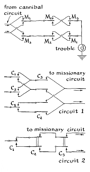 "Outnumbering may occur in these combinations: three to two, three to one and two to one. The complete trouble circuit is shown at the top of page 120. Its action is easier to follow if you divide the circuit into three parts [see page 121] and examine them one at a time. The missionary configuration [top] will register trouble if proper cannibal circuits are closed when any two missionaries are opposite the third missionary. Circuit 1 [middle] conducts when any two or three cannibals are on one side of the river. It also shows which side they are on. Circuit 2 [bottom] similarly indicates when all three cannibals are on the same side of the river and which side they are on. In combination, the three configurations register all the possible trouble situations: (1) when all three cannibals are on the same side with just two, any two, missionaries, (2) when any two or three cannibals are on the same side with a lone missionary. "After constructing a variety of games and puzzles with built-in 'intelligence,' I became interested in the problem of designing a machine with the ability to learn from experience and apply its acquired knowledge in avoiding future mistakes. Claude Shannon's famous 'mouse,' which investigates a maze and learns how to avoid blind passages by trial and error, fascinated me and I decided to have one of my own.