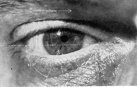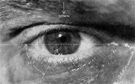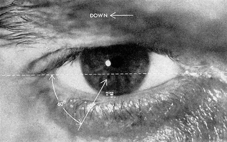 Last November Henri Morgenroth, a consulting engineer of Santa Barbara, Calif., suggested an interesting research project to readers of this department which he thought might be within the capabilities of amateurs. The project was inspired by the article in this department of March, 1954, on the gyroscopic (self-leveling) eye of the copperhead snake. Morgenroth, who had confirmed this phenomenon not only in snakes but also in fish and turtles, wondered why these animals need "gyroscopic eyeballs" when other creatures do not, "or if others have them, which species do-and why?" What sort of evolutionary adaptation, Morgenroth wondered, had freed the higher-order vertebrates from the necessity of eyes with freedom of movement in three dimensions? He suggested that amateur zoologists make a start on the puzzle by observing eye movements. Much to Morgenroth's astonishment, letters immediately poured in from critical readers-some from prominent physiologists. All denied that the eyes of vertebrates could rotate only in two dimensions! "I hate to spoil the fun," wrote one, "but you have no problem to investigate. All vertebrates have eyes." Wrote another: "This rotation can easily be observed by looking into a mirror. If one picks a portion of the iris pattern as a point of reference and tilts his head from side to side he will see his eye rotate about its visual axis a distance of 70 to 80 degrees." A third remarked: "It would be cruel and destructive to perform a step-by-step dissection on the 'gyro-eye' article. Actually Mr. Morgenroth writes in a very interesting and scholarly manner. We can only: wish that the discussion did not depend entirely on the conclusion that the eyes of higher animals do not rotate when they tilt their heads." In support of their criticisms most of the correspondents referred Morgenroth to the book Physiological Optics, by A. von Tschermak-Seysenegg. During the course of his investigation Morgenroth had looked not only into books but also into a mirror. He had found that his own eyes showed so little cyclorotation when he turned his head sideways that they could be considered 2F (rotating only in two dimensions). To find out whether Morgenroth's eyes were unique, we consulted a number of physiologists who study eye movements outside books and the dissection theater. None had made an exhaustive investigation of cyclorotation. So we invited some 50 friends to cooperate in an experiment. The subjects were strapped one at a time to a steel framework which could tilt them to a horizontal position on either side. Rigidly fixed to the frame was a 85-millimeter motion-picture camera. The camera could be focused, close up, on either of the subject's eyes. Starting from the upright position, pictures were made as the subject was rotated slowly sideways, first 90 degrees to the right, then 90 degrees to the left. Any rotation of the subject's eye could be measured by a change of position of natural markings on the pupil. Measurements of the resulting photographs showed that the eye rarely rotated more than two degrees to the side and never more than six degrees-notwithstanding the authorities who speak of 70- to 8O-degree movement! The amount of eye rotation did not increase even when subjects were kept in a horizontal position for as long as 10 minutes. A typical set of these photographs is reproduced at the left.
