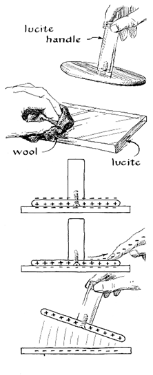 "Secure one of the glass globes which are called phials, about the size of a youngster's head; fill it with sulfur, ground in a mortar and melted by the application of a flame. After it refreezes, break the phial, take out the sulfur globe and keep it in a dry place, not a moist one. Perforate it with a hole so that it can spin upon an iron axle. Thus the globe is prepared. "To demonstrate the power developed by this globe, place it with its axis on two supports in the machine-a hand's breadth above the baseboard-and spread under it various sorts of fragments such as bits of leaves, gold dust, silver filings, snips of paper, hairs, shavings, etc. Apply a dry hand to the globe so that it is stroked or grazed two or three times or more. Now it attracts the fragments and, as it turns on its axis, carries them around with it. "When a feather is in contact with the globe, and afterwards in the air, it puffs itself out and displays a sort of vivacity . . . and if someone places a lighted candle on the table and brings the feather to within a hand's breadth of the flame, the feather regularly darts back suddenly to the globe and, as it were, seeks sanctuary there." After describing numerous other experiments, in some of which the globe produced light and sound, von Guericke concluded: "Now many other mysterious facts which are displayed by this globe I shall pass by without mention. Nature often presents in very commonplace things marvelous wonders which are not discerned except by those who through insight and innate curiosity consult the oracle of experimentation." Ten generations of experimenters have consulted the oracle since von Guericke's day. So fathomless are the mysteries of his sulfur ball that its "marvelous wonders" continue to charm and sometimes baffle experimenters, whether they twiddle the controls of a Van de Graaff accelerator or merely stroke the hairs on a cat's back. But electrostatics has remained chiefly a curiosity. Most people are acquainted with it only in the form of the crackling shock you get when you touch a metal doorknob after walking across a thick carpet in winter. Those who go in for amateur radio grumble that "static is something you cuss, not study!" Static electricity has never become economically important, probably because nature has been more generous in supplying effective conducting substances and magnetic materials than she has in providing good insulators. Our electrical technology is based on electromagnetic devices; our electrical power is generated by magnets and moving conductors. Electrostatic machines have been harnessed for only a few specialties, such as generating high voltage for laboratory experiments and producing high-energy X-rays and sterilizing drugs in medicine. Some engineers believe that electrostatics has big technological possibilities. One of them is John G. Trump, professor of electrical engineering at the Massachusetts Institute of Technology. He points out that the forces resulting from the presence of electric charge are the most direct and powerful in nature. He and his colleagues at M.I.T. are conducting certain investigations which may produce an electrostatic power generator that one day will compete with the electromagnetic generator. Professor Trump illustrates how the power-generating capacity of electrostatic machines may be stepped up by asking you to consider two metallic plates, 100 square inches in area, facing each other and separated by an insulator. If a voltage amounting to an electric field of 300 volts per centimeter is applied between them, the plates will be attracted to each other with a force of one 2,000th of a pound. Increase the field to 80,000 volts per centimeter and the attraction becomes half a pound. Now immerse the plates in a high vacuum-a good insulator, though one difficult to maintain-and increase the field to three million volts per centimeter. The force of attraction jumps to 5,700 pounds! "Force of this order," says Trump, "has more than passing interest for power engineers." Trump and his associates are working on the problem of developing a practicable system of vacuum insulation which would make possible a field intensity of millions of volts per centimeter in a large machine. If they succeed, an electrostatic power generator will become a reality. The working parts of such a machine would look like an oversized variable capacitor with intermeshing leaves. Only the rotor would move. The machine could be constructed of light metal. A generator of this type about the size of a hall bedroom and weighing only a few hundred pounds, could deliver 7,500 kilowatts of power. Its efficiency would be impressively higher than that of an electromagnetic generator. The history of electrostatics began with the discovery of Thales of Miletus that rubbed amber attracted other objects. Through the centuries experimenters like von Guericke explored the "marvelous wonders" of static electricity with a succession of ingenious machines which amateurs may enjoy building. One of the most important historically was Alessandro Volta's elettroforo perpetuo, now known as the electrophorus [Figure 1]. Volta wrote to Joseph Priestley of the Royal Society on June 10th, 1775: "I hereby draw your attention to a body that, after being electrified by a single brief rubbing, not only does not lose its electricity but retains obstinately the indications of its active force in spite of being touched repeatedly any number of times." The electrophorus consists of two working parts: (1) a rectangular block of insulating material such as lucite or, preferably, polyethylene, and (2) a metal disk fitted with an insulating handle. When the lucite is wiped with a woolen cloth, electrons are removed from the cloth and deposited on the lucite-in much the same way that a dirty rag smears a clean sheet of glass. Early experimenters (who used sealing wax, hard rubber or other resinous substances instead of plastic) said that the insu