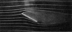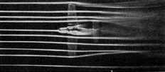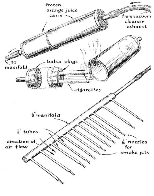"The reason," writes J. J. Cornish of the department of aerophysics at Mississippi State University, "may lie in the nature of aerodynamics and the invisibility of the air itself. Perhaps the solution to the problem lies in making the flow of air visible. The words 'I don't see' have become synonymous with 'I don't understand.' And surely with understanding comes interest. "If so complicated a device as a cloud chamber, which renders cosmic-ray tracks visible, can be reduced to the simple apparatus shown in your April, 1953, issue, surely aerodynamics like wise can be simplified. "The aerodynamic smoke tunnel has long been used to gain a better understanding of various flow phenomena. Alexander Lippisch has made extensive use of the smoke tunnel in designing delta-wing aircraft. The Forrestal Research Center at Princeton University has several smoke tunnels in operation. This aerodynamic tool, the smoke tunnel, is well suited for experiments by amateurs. "I recently constructed a small smoke tunnel which was designed to make use of an ordinary tank-type vacuum cleaner for its source of power [see drawing in Figure 5]. The smoke for the tunnel is obtained from cigarettes. "The tunnel itself is made of two-by-twos and Masonite. The pieces were assembled to form a duct approximately one foot high and two feet long. One end of the duct, the entrance, was flared out to a width of about six inches. The rest of the duct has a width of 1 1/2 inches. One face was then covered with a pane of window glass. A 'screen door' made of fine screening a couple of layers of window screen will do) was made to cover the entrance so as to smooth out the entering air. Toward the other end of the tunnel a hole was cut in the back wall to allow the air to be exhausted by the vacuum cleaner. The cover from a two-inch spool of adhesive tape makes the fitting to attach the vacuum cleaner tube. "The smoke is introduced into the tunnel through a 'rake' made from several pieces of 1/8-inch copper tubing attached to a pipe about half an inch in diameter [drawing in Figure 6]. To this rake is attached, by means of rubber tubing, the smoke generator. The smoke generator is made of two narrow cans and some balsa plugs. I started off with a generator that 'smokes' a single cigarette but soon worked up to a 'three-holer' for a denser smoke. From the other side of the generator another rubber tube is led to the exhaust side of the vacuum cleaner to produce the pressure differential necessary to burn the cigarettes. "After sealing all joints and corners with plastic wood and smoothing the inside of the duct, I painted everything except the glass with flat black paint. "Wonder of wonders, the thing worked on the first try. However, later I became dissatisfied with the smoke filaments and found that, as in mirror grinding, the product improves with attention to detail. I found that the smoke filaments were sharpest when the tubes of the rake were lined up accurately with the center line of the tunnel and when no air leaked in but all the flow came in by the front door. With only a little care sharp, crisp smoke lines were obtained. "Models to be tested are mounted in the middle of the tunnel behind the glass face. With a knob projecting from the back of the tunnel I control the angle between the model and the flow. For best results the models should be big enough to span the 1 1/2-inch tunnel and should be about three or four inches long. "It might be mentioned that the use of cigarettes as the smoke source has the advantage that the exhaust from the tunnel need not be conducted out-of-doors, as in the case of smokes from burning rotten wood or vaporized kerosene, often used in the larger tunnels. Even after a long evening of running, my kitchen is no worse off than after an evening with several cigarette-smoking guests. Supplying the tunnel with three cigarettes at a time has cut down on my own smoking, incidentally. "Photographing the flow patterns obtained in the tunnel is one of the most interesting aspects of this hobby. When you have pictures of the flows, you can study the details at your leisure and compare different conditions. The black background and white smoke streams form contrasting patterns which are easily photographed. If you make pictures, you must pay some attention to lighting and reflectivity. The back wall of the tunnel must be almost absolutely flat black for the best results. Ordinary rough black paper such as is used in photograph albums is not quite black enough to get good contrast, as it reflects about 10 per cent of the incident light. Black velvet or velveteen reflects less than 1 per cent. [Roger Hayward, the illustrator of this department, points out that a sheet of glass painted black on the rear face and lighted from the front at a relatively low angle of incidence would give a much "blacker" black.] "The models should be painted so that they show up in the pictures. At first I painted the models all white but this reflected too much light. Later I found that if the models were given a coat of white paint, then a coat of black paint, and then some of the black paint was scraped away around the edges, the white paint that showed through outlined the model very well. "I used two 200-watt bulbs in reflectors placed at 45-degree angles to the glass to light the smoke lines. The camera was a pre-World War I Kodak, circa 1905. I used plus-X film and a setting of f/8 at one quarter second. "The pictures on the preceding page show the effects on wind flow of an inclined flat plate, a cylinder and an airfoil section. The airplane model shows how the lift on the wings of an airplane causes the flow to curl up into wing-tip vortices as it streams past the wing. Of course many other experiments can be performed. I have done some preliminary work on boundary-layer control, both by suction and by blowing, in the tunnel. The problems of laminar separation and boundary-layer transition are readily studied. "T