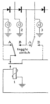 Each of the 12 balls is identified by a number. To use the table, weigh the balls under + 1 against those under -1, then those under +3 against those under -3 and finally those under +9 against those under -9. At each step note which pan is heavier, if either one is, and after the third weighing add up algebraically the numbers at the heads of the heavy columns. The sum will identify the odd ball, and if that number appears in the "heavy" columns, the odd ball is heavier than the others; if it appears in the "light" columns, it is lighter. For instance, suppose that 7 is the odd ball and it is light. On the first weighing the +1 pan will be heavier than -1; on the second, -3 will be heavier than +3; on the third, +9 will be heavier than -9. The sum is + 1 - 3 + 9 = 7. The number 7 appears in the light columns; therefore the ball is light. If there are insomnophiles who wish to venture further into this fascinating territory, Octave Levenspiel of Bucknell University offers more sophisticated problems: "Can you find the odd ball among 13 in three weighings? "Given 15 coins, one identified as genuine, can you find the single counterfeit among them in three weighings? "Is it true that in n weighings (with n greater than 3) one can find two balls heavier than the others among m balls if m = 3n/2 when n is even, or m=2[3(n-1)/2] when n is odd?" In the circuit diagram for Harry Rudloe's "battle of numbers" game, which appeared in this department in the March issue, the operation of the toggle switch did not conform to the description in the text. A corrected diagram is shown below: the dotted lines represent the part of the original diagram that was wrong. The wiring should follow the solid lines. When the toggle switch is at position A, as shown here, the machine's opponent makes the first move. When the game starts with the switch at position B, the machine has made the first move, which consists in extinguishing the first two lamps.