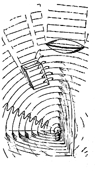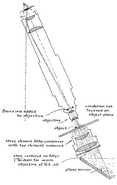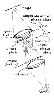 "When I started to use my first microscope," writes John De Haas, an amateur microscopist of New York City, "I thought the only way you could see significant detail in an animal of microscopic proportions was to kill and stain it. I was interested in studying protozoa, particularly the flagellates. But the application of make-up to my performers ended the show before the curtain went up. I wanted to study the internal structures of my animals as they swam, fed and reproduced. That meant that I had to work with light alone. As things developed, Rheinberg color illumination, dark-field lighting and even an inexpensive version of phase-contrast microscopy all proved within easy reach of my facilities. Astonishing increases in effective resolving power, I learned, are possible even with bright-field illumination. You simply block off 95 per cent of the light from certain directions. Beginners often make the mistake of flooding their specimens with light and thereby washing out all detail. "The effect is easy to demonstrate. Assume that you have a medium-priced microscope fitted with an eight-millimeter objective, an Abbe condenser and an eyepiece capable of giving the instrument a magnification of 150 diameters or so. Put a slide of diatoms under the objective. Focus on one of them carefully and fiddle with the lamp, mirror and condenser adjustments until maximum detail appears. The chances are good that you will see the diatom in sharp outline against the bright field. The body will show little detail beyond a fuzzy pattern of striations. Substituting an eyepiece of higher power will not help much. The striations will appear bigger-but proportionately fuzzier. At this point many amateurs decide they need a better microscope. There is another way out, and it costs much less. "Cut a disk of black cardboard to fit the filter carrier of the substage and make a quarter-inch hole in the disk midway between the center and the edge. Without disturbing the adjustment of the instrument, slip the disk into the substage. You will find a position where, despite the lower intensity, an astonishing amount of detail comes into view. The striations stand out sharp and clear and, depending upon the structure of the diatom, you will observe that the striations are rows of objects still more minute. By moving the disk slightly up and down or sideways, or rotating the stage, even smaller details can be resolved." This technique, De Haas explained, is a form of oblique bright-field illumination. Nothing is coming though the eyepiece that was not there before. When the iris of the condenser is wide open, contrasting details of light and shadow in the image are submerged in glare because the deviated rays comprising the first- and lower-order spectra, that carry the fine details of the specimen, are faint when they are compared with the direct or zero-order rays. It is interesting to examine and manipulate the spectra because this enables you to predict the resolution even before you look at a specimen. To view the spectra you observe the back lens by removing the eyepiece and substituting a pinhole. You will also need a series of opaque disks punched with a quarter-inch hole, the position of which progresses through the series from the center to the edge. With the iris of the condenser wide open, focus the microscope on the diatom as described in the De Haas experiment and look through the pinhole at the back lens of the objective. The lens will be flooded with light to its edge. Now slowly close the iris. As the image of the iris in the back lens becomes smaller and smaller, the edges of two colored disks will appear at opposite sides of the field. The edges nearest the white disk will be an intense violet that shades into blue. These are images of first-order spectra. The fine structure of the diatom is acting as an amplitude diffraction grating, and hence some of the rays are deviated from the central beam. Now insert one of the opaque disks which has been perforated slightly off center into the filter holder and open the iris wide. The radius on which the perforation lies should be lined up with that of the spectra. The pinhole will now show that one of the colored images has in effect advanced into the field of view, while the white image and the other colored one have retreated an equal amount. Substitute in the filter holder the remaining opaque disks of the series one at a time for the initial disk. In effect this moves the perforation successively farther from the center. Observe that as the first-order spectral image advances more and more into the field, it shades through the colors of the rainbow and that, as it comes fully into view, a fainter companion appears at the edge. This companion is the second-order spectra. Depending upon the characteristics of your objective and the specimen, you may be able to entice as many as three orders into view before the white zero-order disappears. Moreover, by rotating the specimen or adjusting its lateral position slightly you may be able to bring other spectra into view at right angles to those already in the field. When you have accomplished this, substitute an eyepiece for the pinhole. The specimen will bristle with detail! The explanation of why high resolution is associated with spectra is found in the wave nature of light. Except for shadows of gross objects cast by zero-order rays, the microscopic image is formed by interference at the focal plane of the eyepiece between rays that have been diffracted at the object, as shown in Roger Hayward's drawing at the upper right on this page. The technique of increasing effective resolution by the use of an off-center diaphragm may be considered a form of annular illumination, in which the specimen is lighted by a hollow cone of light. Most of the cone is missing in the above experiment, but it would be complete if a ring of perforations were extended all around the opaque disk. A luminous cone would then surround