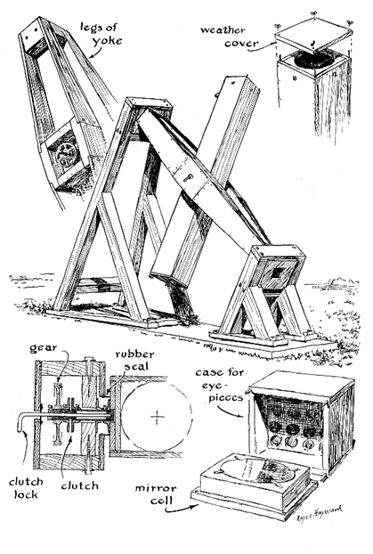 As observed in the experiment with oblique lighting, the spectral orders spread across the aperture of the objective's back lens and converge at the plane of the eyepiece. The condenser is adjusted so that direct rays from the source meet at the back focal plane of the objective, as shown by the top drawing on this page. Hence rays which pass through the center of the back focal plane and those transmitted through the complementary area ( the spectral orders) are out of phase by 90 degrees. When this difference is adjusted so that the two arrive at the focal plane of the eyepiece precisely in or out of phase, interference takes place and an amplitude-contrast image results as in conventional bright-field illumination. Zernike corrected the phase difference by inserting an annular phase plate in the path of the direct wave, as shown in the bottom drawing on this page. In addition he coated the plate with a layer of light-absorbing material just dense enough to reduce the intensity of the direct wave to that of the deviated wave so that complete addition or cancellation would take place. This prevents the image from being masked by the excess light of the direct wave. As subsequently improved, plates are designed either to advance or in effect retard the direct wave and thus result in either constructive or destructive interference. Constructive interference causes a bright object to appear against a neutral background. Destructive interference reverses the effect. A set of phase plates, together with accessories including a condenser annulus and a telescope for aligning elements in the optical train sells for about $200. De Haas devised a form of phase contrast for the amateur which approximates the results of the Zernike technique and costs less than $20 It works well where phase difference amounts to a 20th of a wave or more. De Haas's project was supported by a grant from the Pennsylvania Academy of Science and was reported in the Academy's journal last year, His setup requires a three-element Abbe condenser with the top lens removed, an iris or Davis diaphragm for use with a four-millimeter objective of the dry type, a 16-millimeter objective and individual stops (made with opaque lacquer on daylight filters of medium shade) for each objective. These are inserted in the filter carrier beneath the substage condenser. The size of the stops must in general be determined experimentally. For a 16millimeter objective of .25 numerical aperture the stop diameter should be 19/64 inch. A four-millimeter objective of numerical aperture .65 requires a stop of 21/82 inch. An appropriate stop is inserted in the filter holder, the eyepiece removed and the image of the stop carefully centered by eye in the back lens of the objective. The lamp must also be centered on the optical axis. A specimen is then placed on the stage and focused. A position of the condenser will then be found where details of the specimen stand out in sharp contrast-lighter or darker than the surrounding field depending upon the adjustment. When using the four-millimeter objective, the position of the Davis iris influences the result and the best adjustment must be found by trial and error. The technique contrasts with dark-field microscopy, where the condenser must lie in exact focus at the object plane and in which the object is always brighter than the field. The De Haas system appears to work on the principle of fringes diffracted by an edge-the stop providing the edge. The objective diaphragm probably acts on these fringes and those from the specimen so that they get added as in the Zernike system. De Haas has not attempted a theoretical analysis of the system. His optical train is shown Figure 6. Photomicrographs showing a specimen of Amoeba limax made with ordinary transmitted light and by the De Haas system appear in Figure 5. Correspondence reaching this department during recent months reflects concern among amateur astronomers with the design and construction of rock-solid mountings for their telescopes. This is particularly true of amateurs who go in for celestial photography, variable star observing, the precise timing of lunar occultations and so on. Knife-sharp photographic negatives and clear photoelectric recordings cannot be made with an instrument that jiggles. In general the problem of achieving the desired stability has been attacked in two ways. The first reduces the difficulty by exchanging a pronounced slow wobble for a less-pronounced fast one. Low amplitude is bought at the price of high frequency. Axes are made heavier and overhang is reduced to a minimum. In other words the "pendulum" is stiffened and shortened. It is possible to increase the rate of vibration of six-inch instruments to as much as 10 cycles per second by using stubby shafts for axes and appropriately light materials in the construction of the tube and its accessories. However, even this relatively high frequency is well within the range of a good photoelectric recorder. It can easily mask the subtle features of occultation recordings. Thus most designers tackle the problem by the second method: increasing the effective diameter of the axes. A now-classic example of this type of design is represented by the Springfield mounting introduced 85 years ago by the late Russell W. Porter and described in Amateur Telescope Making-Advanced. But even though the Springfield axes are defined by plates as broad as the telescope's mirror, physicists of the Army Map Service found it necessary to substitute oversized ribbed castings before the design would yield useful occultation records. Perhaps the simplest way of increasing the effective diameter of axes is to adopt one of the numerous yoke designs. They are cumbersome, of course, and troublesome to move. But if you are willing to sacrifice portability for stability of operation, a good yoke mounting is your dish. W. P. Overbeck, of Aiken, S. C., has built one that he swears can function simultane
