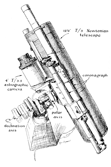 The natural fascination of watching things that move may largely explain the amateur astronomer's dream of owning an instrument that makes prominences visible. Because the prominences are so large by terrestrial standards, the appear to move lazily. But like the slow movement of the hour hand of a clock, their transformations can easily be perceived over a matter of minutes. When recorded by time-lapse photography and then projected as a motion picture, prominences are an awesome spectacle of nature. Henry Paul of Norwich, N.Y., chemist and amateur astronomer, has written: "Spine-tingling excitement tinged with awe usually accompanies the first viewing of an eruptive prominence. These millions of tons of glowing gas often stream back in graceful arcs to the surface as if drawn by a huge magnet." A good spectrohelioscope requires 17 optical surfaces and an original defraction grating (a replica grating will not work). This doubtless explains why so few amateurs have built these instruments. This department knows of only five spectrohelioscopes made by amateurs-four in Great Britain and one in the U. S. The American instrument was destroyed in a fire. Paul's exciting experience came not out of a spectrohelioscope but from a newer instrument called the coronagraph. Where the spectrohelioscope sorts out the red light of hydrogen by means of a diffraction grating, the coronagraph does so with a remarkably selective filter known as the quartz polarizing monochromator. In general the coronagraph is the better instrument. One astronomer who began as an amateur telescope maker and has used both instruments says that the views with the coronagraph are enough to make a spectrohelioscope man feel that his life has been wasted. Another calls this an understatement. The older instrument does enjoy some advantages. It is superior, for example, in revealing details of the chromosphere, unless the design of the coronagraph is carried to the extreme limit of its capability-at greatly added cost. Moreover the spectrohelioscope may be adjusted to filter light of any color. The coronagraph was independently invented by several astronomers: first the late Bernard Lyot of France and later Yngve Ohman of Sweden and John S. Evans of the U. S. (who began as an amateur telescope maker). Three amateurs are known to have built coronagraphs using the quartz polarizing monochromator: David Warshaw of Brooklyn, N.Y., who spent several years at the task and accomplished it in a kitchen without machine tools; Paul, who gained some insights in personal visits with Warshaw; and Walter J. Semerau of Kenmore, N.Y., who was aided by Paul's published instructions in Amateur Telescope Making-Book Three and directly by Paul. After using his instrument for a year, Semerau writes: "My coronagraph performs well beyond all my expectations. Building it was the most fascinating fun I ever had." The prominence photographs on page 195 were made with this instrument. Semerau mounted his coronagraph on the same telescope axes that support a 12.5-inch astrographic camera he had made earlier. At the bottom of the coronagraph tube a pair of right-angle prisms jacknifes the light beam from the long-focus objective [see drawing in Figure 2]. Hence what appears to be parallel tubes is in effect a very long single tube folded for the sake of convenience. In one part of the tube the light passes through a rectangular box containing the quartz polarizing monochromator. The monochromatic light emitted by the prominences is passed upward into the eyepiece by a reflex mirror. Light of other colors is absorbed by filter and dissipated in the form of heat. The light can be directed into either of two cameras by moving a small lever attached to the mirror. The instrument can thus serve as either a coronascope or a coronagraph. The arrangement enables the observer to view prominences up to the instant when he wishes to make a photograph. The drawing shows a 35-millimeter camera in place. It may be replaced by a 16-millimeter time-lapse camera. The business end of the coronagraph is a quartz polarizing monochromator. Though it is a filter, the term is misleading because it suggests simple glass or gelatin filters. Even the best of these would transmit a band of color much too broad. The filter must exclude all light waves which do not fall within a single hydrogen line-a band of about three to seven Angstrom units in the 3,750 Angstroms of the visible spectrum. To accomplish this the quartz polarizing monochromator sends the light through a stack of six or more quartz plates. At the top and bottom of the stack and between each pair of plates are sheets of polaroid. In addition to this filter the coronagraph requires a cone of metal (the circular bottom of which eclipses the sun in the instrument), a field lens, a diaphragm, a lens to send the rays parallel through the quartz plates and another lens to focus the emerging rays. Since the filtered light of a prominence is narrowly monochromatic, the objective lens of the coronagraph need not be corrected for color. In fact, a single-element lens works better than an achromat. The lens must be superlatively free of bubbles, striae, dirt, dust and even microscopic scratches which would diffract light. Single-element lenses may also be used beyond the eclipsing cone; these need not be so free from defects. A reflecting telescope cannot be used for a coronagraph because irregularities in the metal reflecting surface diffract light. The quartz polarizing monochromator has other demands. It is an incurable thermometer watcher. It misbehaves unless the temperature is held constant within about one degree of a predetermined value, usually between 100 and 125 degrees Fahrenheit. This is usually done by heater bulbs, a fan and a thermoswitch. The principle by which the quartz polarizing monochromator works has been explained many times but never so lucidly as by Evans in a leaflet issued by the semiprofessional Astron