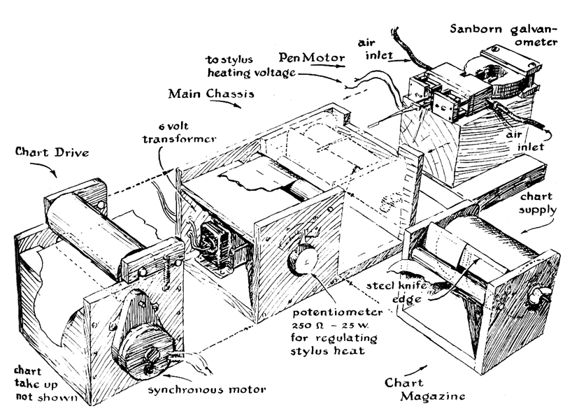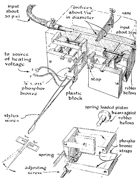 "At the low-frequency end, nature provides some ready-made recorders. The age of galaxies is recorded in their slowly changing form. The eras of the earth's evolution have been registered as strata in the rocks. The cycles of climate and other annual events can be read in tree rings and varves (lake-bottom mud deposits). And for recorders of more rapid events we have the deposits left by flash floods, the craters left by meteorites and the fused substances marking points where lightning has struck. "There are certain important gaps in the spectrum where nature fails to furnish a record. Most of the interesting ones lie in the frequency band between a few hours and an infinitesimal fraction of a second. To bridge these gaps modern instrument makers have devised various types of recorders. All of them consist essentially of a pen which automatically traces a record of the observed event on a chart of some kind. The pen may be linked to any kind of detecting or observing instrument-a barometer, a thermometer, a seismometer, a telescope or whatever. The sensing instrument translates what it observes into a signal- mechanical or electrical-which drives the recording pen. A recording instrument has two paramount advantages over a pencil-using human recorder: it can operate tirelessly around the clock and it is capable of responding to much higher frequencies. "The chart on which the instrument's pen writes may be a fixed sheet, a moving ribbon, a cylinder or a disk. The pen may be powered directly by the energy of the event itself (as in an old-fashioned seismograph) or may be driven by a motor actuated by an amplified signal from the event (as in a starlight photometer). "The varieties of events to which a recorder may be applied are legion. Albert G. Ingalls, formerly editor of this department, spent his first summer in retirement recording the tidelike seiches (vibrations) of Seneca Lake in New York by means of a mechanically-actuated pen recorder which he constructed during the winter months. Studying his graph, 90 feet long, he found that the 35-mile lake had a long-period vibration of 56 minutes. He is now analyzing higher-frequency modes which appear as tiny peaks on the graph. The study promises to disclose interesting information about the shape of the lake bottom, as well as clues to the forces responsible for the seiches. Another amateur, John Ruiz of Dannemora, N. Y., recently constructed a seismograph of the velocity type and is recording movements of the earth's crust through the range of 30 seconds per vibration to half a second. His home-built recorder employs electronic amplification. John Wilke of Chicago has fitted his eight-inch reflecting telescope with a photoelectric cell photometer and an electronic recorder which enable him to plot the decay of starlight during occultations in increments of two hundredths of a second. Radio hams and high-fidelity addicts study vibrations in the range from about 20 per-second to billions per second. You find these amateurs investigating everything from the characteristics of transistors and home-made loudspeakers to the electromagnetic resonance of chemical compounds. "Amateurs frequently ask for advice about the best kind of recorder to buy or build. Usually they have in mind a universal recorder-one that will accept signals from many types of sensing instruments. The criterion of selection is frequency response. The pen of the ideal recorder should be capable of deflection for frequencies 10 times higher than those anticipated in the variable under measurement. Thus if it takes a tenth of a second for the moon to occult a star, the photometric recorder should have a minimum response time of a hundredth of a second. Such a recorder will give a 'flat' response: that is, at every frequency the signal will deflect the pen by the same amount, thus tracing a straight line. Instruments of poor response, in contrast, will not respond uniformly to all frequencies, and therefore the graph will be a curve. "A flat response is not necessary for all purposes. Sometimes a less than ideal instrument will do. One amateur biologist now investigating the circulatory system of the frog wanted to make recordings of the electrical impulses liberated by the beat of the animal's heart. He was interested in frequencies up to 200 cycles per second. He built an instrument around a war-surplus oscillograph but found that the pen covered only 7 per cent of its full-scale swing at 200 cycles and 50 per cent at 60 cycles. By taking this limited response into account, however, he could interpret the records as faithful measurements of the frog's heart action. "The high cost of direct-writing recorders has discouraged many amateurs from taking up such hobbies as variable star observing, seismology, micrometeorology and other avocations in which precise records are essential. A good chart drive and pen motor sells for about $300. A companion amplifier and power supply adds another $500. Equipment for dividing or multiplying the incoming frequencies and thus extending the range of the basic combination, plus equalizing amplifiers to compensate for distortion, can shoot the investment into the stratosphere. But if you have access to a drill press and a small lathe, you can make a good wide-range recorder at a cost of less than $250. "You start with the pen motor, the heart of any recorder. A number of basic types are shown in the drawing on page126. Most commercial instruments utilize the d'Arsonval movement in one form or another. Its construction, however, is strictly a job for the experienced instrument maker. In contrast, pneumatic pen drive is relatively easy and inexpensive to make. It consists of a simple bellows linked to a pivoted lever which carries the pen on its outer end. The pneumatic motor may appear crude, particularly to devotees of electronic technology. Yet when coupled to a nozzle of the type shown above, the pneumatic motor is capable of astonishin