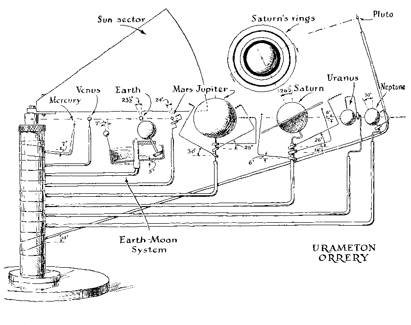 The imminent attempt to launch the first man-made satellite into space undoubtedly will heighten interest in the planets and satellites of the solar system and their motions. One of the most interesting refresher courses you can take on these matters is to construct an orrery. This classic model of the solar system, long a fixture of physics classrooms and planetaria, was named by its inventor, George Graham, after his patron, Charles Boy]e, Fourth Earl of Orrery. An English engineer, Frank W. Cousins, submits the design for a simple orrery pictured here [see Figure 5]. "The orrery," writes Cousins, "shows all known planets-except the minor ones -from Mercury to Pluto, with their satellites. You will find an imitation pearl necklace with beads of various sizes a splendid source of spheres to represent the planets. The scale of sizes here is based on a bead one eighth of an inch in diameter for the earth. The satellites are too small to be scaled to this standard and therefore are represented by small beads of uniform size. "A circular scale mounted on the base gives the zodiac, the months and the right ascension from zero to 24 hours. The sun sector, attached to the tip of the central spindle, is made to scale and gives some idea of the great size of the sun when compared with that of the planets. "The planets are mounted on arms with devices for showing their inclination to the plane of the ecliptic. In the cases of Mercury and Pluto, this is managed by means of tilted washers on the central spindle. For the earth, Mars, Saturn? Uranus and Neptune we use Z-shaped axis rods turning in deep sockets at the ends of the orbit arms. "The central spindle and washers are of brass and the orbit arms are of silvered steel. "As you doubtless know, we English have a custom of naming the things we make. I call this instrument the 'Urameton Orrery.' I have had a lifelong interest in the physics of astronomy, and when uranium 235 came into prominence I chanced to remember the Metonic cycle (235 lunations equals 19 years). My address is 235 Bilton Road, Greenford. I was so impressed by the coincidence that I immediately christened my observatory Urameton!"