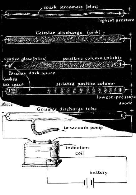 Watson, not realizing that a gas becomes a better conductor of electricity as its pressure is lowered, considered his experiment a failure. He named his bulb the "aurora tube" and bequeathed it to the world as a curiosity. Actually it is doubtful that any phenomenon found in nature has been more fruitful than Watson's discovery of the glow discharge. It gave rise to multitudes of experiments by thousands of physicists. Modifications of Watson's tube-cathode-ray tubes- led Wilhelm Roentgen to the discovery of X-rays, J. J. Thomson to the discovery of electrons and John Fleming to the invention of the radio tube. More recent versions of the tube have become familiar in the shape of neon signs, Geiger counters, fluorescent lamps, voltage regulators, counting tubes for digital computers and many other gadgets. Forrest H. Frantz of Mississippi State College, a physicist who has made a specialty of investigating varieties of these tubes, observes: "We can discern no end to these remarkable diggings. The more we work them, the more pay dirt we strike. Within the last 10 years one branch, which has to do with the leaky insulators called semiconductors, yielded the transistor, a device which may well open a whole new era of technology. Another promising line of work going on now has to do with the way electrons are emitted by electrodes shaped into exquisitely fine points [see "A New Microscope," by Erwin W. Muller; SCIENTIFIC AMERICAN, May, 1952]. Another branch is the micro-gap-a pair of closely spaced electrodes which behave in unexpected ways when a voltage is applied across them. An amateur who has not checked into electrical discharges, particularly glow discharges, is missing out on a chance for some fascinating experiments. "One of the first to make real headway in the field of glow discharges was the French physicist J. P. Gassiot. By introducing traces of individual gases into the aurora tube, he produced glows of various characteristic colors. Neon gave an orange glow; hydrogen, crimson; mercury vapor, violet, and so on. Gassiot's work was one of the stepping stones toward modern spectroscopy. "The great popularizer of the glow discharge was an amateur-the German Heinrich Geissler. By profession he was an instrument maker, but his name is remembered for his work on discharge tubes. He made them in such profusion and in so many intriguing shapes and forms that they are known as 'Geissler tubes.' It seems ironic that he should be known as the father of neon advertising signs while the name of Masson, their discoverer, goes almost unmentioned. "By 1869 it was clear that rarefied gas conducts better than gas under pressure for the reason that molecules have greater freedom of movement in a partial vacuum. But if the last molecule could be removed from a tube, the conduction should, it was reasoned, drop to zero. Johann W. Hittorf of Germany built a really good air pump in order to confront this theory with a conclusive test. Although the pump did not achieve the primary objective, the by-product of the experiment assured Hittorf a lasting place in the history of science. As the pumping progressed past where the characteristic glow appeared, Hittorf observed near one of the electrodes a dark region which grew larger as the pressure dropped. He also noted a strange fluorescence that lighted the walls of the tube behind the positive electrode. He suspected this fluorescence was excited by rays emitted by the negative electrode. To test this, he sealed a small cross of lead inside the tube between the cathode and anode. It cast a shadow. As we now know, it was blocking a stream of electrons coming from the cathode. Here was the primitive beginning of television! "The behavior of electrical discharges through a gas is influenced by many factors which can be adjusted to produce a dazzling variety of effects. The most important variables are: the pressure of the gas in which the discharge occurs, the type of gas, the size of the gap between the electrodes in the tube, and the details of the electrical circuit, the cathode material, the shape of the electrodes and the voltage across the gap. "Not all these elements conveniently controlled in a home-built apparatus. Probably the easiest to play with is the pressure. To duplicate the effects pictured here [see Figure 1] you will need a 12-inch glass tube with electrodes sealed in, a fair vacuum pump and a high-voltage source. The tube can be bought at a scientific supply house. The pump which may be a mechanical one of the piston type, is not difficult to build, but the piston and valves must be fitted closely and should be sealed with a good grade of stopcock grease. The necessary voltage (about 15,000 volts) can be obtained from an induction coil as shown. A direct-current machine would be preferable, because the pattern of the glow is determined by the direction in which the current flows, but such machines are expensive. For casual observations an induction coil will do. It produces an alternating current, but with a much stronger surge in one direction than the other. The strong voltage pulses come fast enough so that the discharge will appear steady although it is actually intermittent. "It is interesting to apply a constant voltage to the electrodes of the tube and observe the results as the pressure is progressively lowered. "If the experiment is performed in a fairly dark room, you will see the glow of the corona discharge around the electrodes, when the voltage is applied. Then, as the pressure drops, occasional spark streamers crackle across the entire gap. These are like extremely thin lightning flashes. When the pressure gets down to about a hundredth of an atmosphere, the streamers appear continuously and in great numbers. Shortly thereafter the sparks give way to a silent glow-the pink of the aurora, sometimes called the Geissler discharge. With further lowering of the pressure the pink glow pulls away from the cathode, leaving a brig