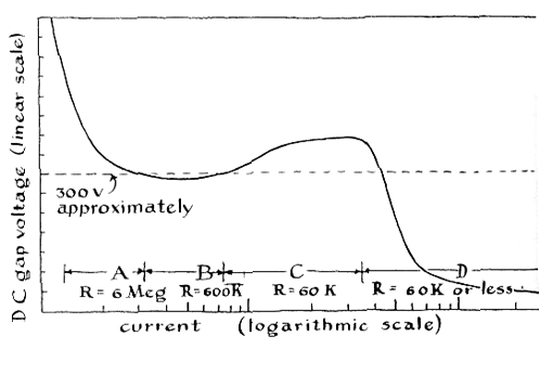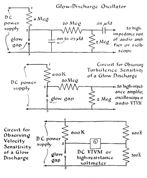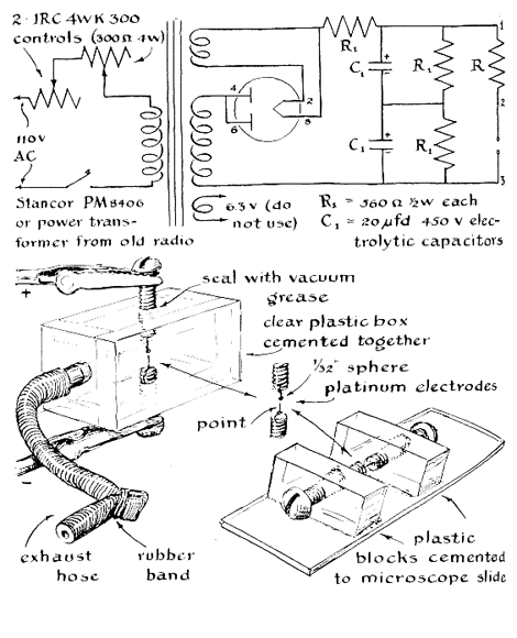 "Micro-gaps operate on relatively low voltages, which can be derived from transformers of the type used in radio receiving sets. The circuit for an adequate power supply is shown in the upper part of the drawing below. The output can reach about 900 volts, hence the experimenter should exercise appropriate caution when working with it. The voltage is varied by means of two rheostats connected in series with the primary circuit of the power circuit of the power transformer. "An enclosed gap will sustain a glow discharge across as much as a quarter of an inch of separation if the pressure is made low enough. For the pump you use a converted automobile-tire pump. You simply reverse the piston washer and give it a thick coat of stopcock grease. The pump then sucks in air when the handle is pulled up. One sharp stroke of the pump handle will exhaust the gap sufficiently for most observations. The vacuum is maintained by clamping the hose immediately. All the characteristic effects of the larger glow discharges will appear in the little gap, but in reverse order as air leaks slowly into the enclosure. "The best material to use for the electrodes is platinum wire, but copper or will do. Both electrodes may be pointed, or the cathode may be spherical and the anode pointed. This makes it easier to align the electrodes. You can make a spherical anode by connecting two short lengths of fine platinum wire to the power supply, bringing the tips together and then separating them. The arc that forms will melt the tip of one of the wires and surface tension will draw the molten metal into a bead. To limit the arc current, a resistor should be placed in series with one of the wires. For a platinum wire five thousandths of an inch in diameter the resistance should be 60,000 ohms. Thicker wire requires a smaller resistance. "The resistor also serves as an automatic voltage and current regulator in the completed apparatus. You need a higher voltage to start a glow than to keep it going. At the instant the switch is turned Oil, before a spark has jumped the gap, there is no current. The full 900 volts of the power supply are exerted across the gap. When the gap is ruptured by the spark and electricity flows, some of the available pressure is used up pushing the current through the resistor. The voltage is now divided so that there is about a 600-volt drop through the resistor and a 300-volt drop across the gap. "The upper limit of current through the gap can be adjusted by varying the resistance. If it is 60,000 ohms, the maximum will be about 10 milliamperes. For values of 600,000 ohms and six megohms, the upper limits are approximately one milliampere and a tenth of a milliampere respectively. (You may find that radio supply dealers do not stock resistors in these values. If not, the generally available values of 56,000, 560,000 and 5.6 million ohms, in the two-watt size, are satisfactory.) "Open gaps of the type shown in the lower right portion of the drawing in Figure 2 have not received as much attention as those designed for operation at reduced pressure. Their electrode spacings cannot be more than about five thousandths of an inch. Unless they are studied under a microscope, many details of the glow will be missed. My son's toy microscope in the 50X range gives satisfactory results It shows, in addition to other details, the overheating of the cathode when the current is too high and bright flashes as bits of metal are sputtered off the cathode by positive ion bombardment. "By adding a vacuum tube voltmeter or a sufficiently sensitive ammeter to your apparatus, you can determine the current flowing in the gap circuit. This will show the remarkable way in which the resistance of the gap varies through a wide range of applied voltage. The voltmeter measures current indirectly. You hook it across the resistor and measure the voltage drop. Dividing this figure by the value of the resistor gives the current through it, and, since the two are in series, through the gap also. It is more convenient, of course, to measure the current directly with an ammeter of appropriate range. "An ammeter capable of measuring the billionth-ampere range will show that current actually starts to flow whenever a voltage, however small, is applied across the gap. This current consists of electrons dislodged from the metal of the electrodes by the action of light and also of electrons knocked off atoms in the air by cosmic rays and natural radioactivity. Normally these negative particles merely bounce around in the gap at random. When voltage is applied across the electrodes, however, they are pushed toward the anode, and the movement constitutes a current. As the voltage is increased, more of them join the parade and the current grows. A point is finally reached when all that are released reach the anode; further increases in voltage then fail to produce corresponding increases in current. If the gap is now shielded from light, the current will drop sharply. It does not fall to zero, however, because cosmic rays and radioactivity continue to create ions. Thus in the beginning the conductivity of the gap depends on the action of light and other external radiation. It is not self-sustaining. "As the voltage is increased further, a point is reached when the accelerated electrons acquire sufficient energy to dislodge other electrons from the gas molecules by collision. These new electrons and resulting positive ions now join the current, are accelerated and in turn acquire ionizing energy. Thus the current increases exponentially. This phenomenon is called gas amplification. Although the current represented by the original photoelectrons has been increased enormously, the conductivity of the gap is not yet self-sustaining. When the light is shut off, it will drop to near zero. This is the region of the corona discharge. "A slight further increase in voltage will cause the current to increase faster than the exponential rate. The g