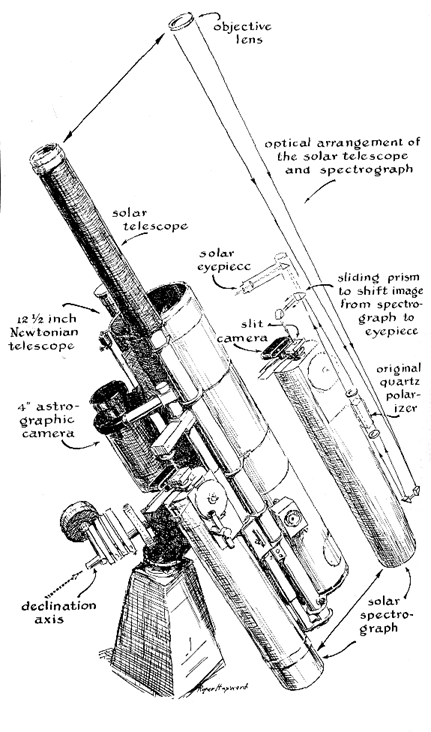 Having built the monochromator, Semerau felt he was ready to attempt one of the most demanding jobs in optics: the making of a spectrograph. Directly or indirectly the spectrograph can function as a yardstick, speedometer, tachometer balance, thermometer and chemical laboratory all in one. In addition, it enables the observer to study all kinds of magnetic and electrical effects. In principle the instrument is relatively simple. Light falls on an optical element which separates its constituent wavelengths or colors in a fan-shaped array; the longest waves occupying one edge of the fan and the shortest the other. The element responsible for separation may be either a prism or a diffraction grating: a surface ruled with many straight and evenly spaced lines. The spectrograph is improved by equipping it with a system of lenses (or a concave mirror) to concentrate the light, and with an aperture in the form of a . thin slit. When the dispersed rays of white light are brought to focus on a screen, such as a piece of white cardboard, the slit appears as a series of multiple images so closely spaced that a continuous ribbon of color is formed which runs the gamut of the rainbow. As previously discussed in this department [June, 1955], each atom and molecule, when sufficiently energized, emits a series of light waves of characteristic length. These appear as bright lines in the spectrum and enable the investigator to identify the chemical elements of the incandescent source. Similarly, the atoms of a gas at lower temperature than the source absorb energy at these characteristic wavelengths from light transmitted through the gas. The absorption pattern appears as dark lines. As the temperature of the source increases, waves of shorter and shorter length join the emission, and the spectrum becomes more intense toward the blue end. Thus the spectral pattern can serve as an index of temperature. The characteristic lines of a substance need not always appear at the same position in the spectrum. When a source of light is moving toward the observer, for example, its waves are shortened- the Doppler effect so frequently mentioned in this issue. In consequence the spectral lines of atoms moving toward the observer are shifted toward the blue of the spectrum. The lines of atoms moving away are shifted toward the red. Velocity can thus be measured by observing the spectral shift. When an atom is ionized, i.e., electrically charged, it can be influenced by a magnetic field. Its spectral lines may then be split: the phenomenon known as the Zeeman effect. Intense electrical fields similarly leave their mark on the spectrum. These and other variations in normal spectra provide the astrophysicist with most of his clues to the nature of stars, nebulae, galaxies and the large-scale features of the universe. The amateur can hardly hope to compete with these observations, particularly those of faint objects. However, with well-built equipment he can come to grips with a rich variety of effects in the nearer and brighter ones. "If you are willing to settle for the sun," writes Semerau, "you shuck off a lot of labor. A three-inch objective lens, or mirror of similar size, will give you all the light you need. The rest is easy. Many amateurs have stayed away from spectroscopes because most conventional designs call for lathes and other facilities beyond reach of the basement workshop, and many are too heavy or unwieldy for backyard use. "About four years ago I chanced on a design that seemed to fill the bill. My employer, the Linde Air Products Company, a division of the Union Carbide and Carbon Corporation, needed a special spectroscope for industrial research and could not find a commercial instrument that met their specifications. The Bausch & Lomb Optical Company finally located a design that looked promising. As things worked out, it was adopted and is now on the market. My instrument, shown mounted in Figure 2, is a copy of that design. "The concept was proposed by H. Ebert just before the turn of the century. The instrument is of the high dispersion, stigmatic type and employs a plane diffraction grating. As conceived by Ebert, the design was at least 50 years ahead of its time. In his day plane gratings were ruled on speculum metal, an alloy of 68 per cent copper and 32 per cent tin which is subject to tarnishing. This fact alone made the idea impractical. Ebert also specified a spherical mirror for collimating and imaging the light. Prior to 1900 mirrors were also made of speculum metal. It was possible but not practical to repolish the mirror but neither possible nor practical to refinish the finely ruled grating. Consequently a brilliant idea lay fallow, waiting for someone to develop a method of depositing a thin film of metal onto glass that would reflect light effectively and resist tarnishing. Then John Strong, now director of the Laboratory of Astrophysics and Physical Meteorology at the Johns Hopkins University, perfected a method of depositing a thin film of aluminum on glass. "The process opened the way for many new developments in the field of optics. One of these is the production of high-precision reflectance gratings ruled on aluminized glass. Prior to being coated the glass is ground and polished to a plane that does not depart from flatness by more than a 100,000th of an inch. The metallic film is then ruled with a series of straight, parallel saw-tooth grooves-as many as 30,000 per inch. The spacing between the rulings is uniform to within a few millionths of an inch; the angle of the saw-tooth walls, -the so-called 'blaze angle,' is held similarly constant. The ruling operation is without question one of the most exact mechanical processes known, and accounts for the high cost and limited production of gratings. "In consequence few spectrographs were designed around gratings until recently. About five years ago, however, Bausch and Lomb introduced the 'certified precision grating.' These ar