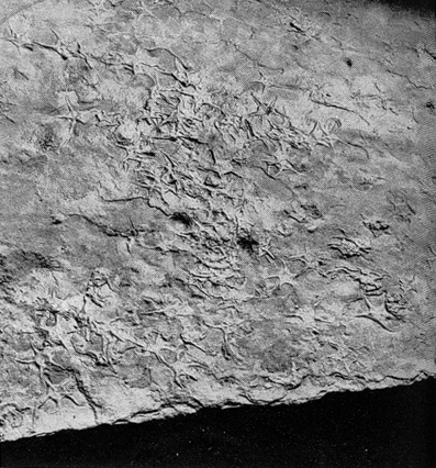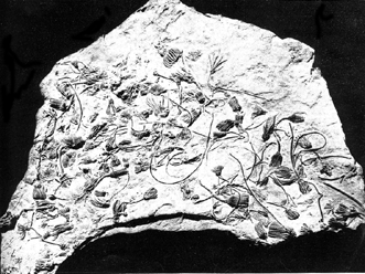 Echinoderms typically have a radially symmetrical form, as In the starfish. In addition to the rayed structure, sea lilies are provided with a stalk which extends down from the center of the body to a rootlike structure at the lower end which enables the animal to grasp the bottom. Its petal-like arms wave continuously in search of food, and any particles encountered are conveyed down a groove to the mouth at the center. After death the soft tissues binding the skeleton disintegrate, and water currents scatter the minute plates over the bottom, where they are usually crushed beyond recognition by the weight of accumulating debris. During the mid-Mississippian period some 300 million years ago, often called "the age echinoderms," a great deal of limestone was formed by this process, and in some midwestern localities the beds are nearly half a mile thick, interrupted only occasionally by veins of shale or sandstone marking intervals when the inland sea temporarily withdrew. Until the discovery of the LeGrand fossils, few paleontologists had ever seen a complete fossil specimen of a crinoid. But under certain conditions- e.g., quick burial under a thin layer of silt which excludes oxygen and bacterial invasion-the soft tissue of a crinoid may be replaced by deposits of calcium and magnesium compounds. These conditions were met in a remarkable way in a small area of what is now a rock quarry about a half-mile north of LeGrand. There the first major deposit of crinoids was discovered 75 years ago. "This quarry," writes Beane, "has served for more than a century as a major source of stone used in the construction of the Iowa buildings and highways. The Kinderhook beds at LeGrand are an outcrop of the Hampton formation. Descriptions of crinoid fossils discovered here have appeared in geological literature since 1890. Fragments of individual fossils were discovered in the vicinity by James Hall, a New York State geologist, in 1858. But the first really productive deposit was uncovered 40 years later, when workmen operating on one of the rock ledges near the Iowa River in the south half of the quarry came upon a circular colony of echinoderms, mostly crinoids, at a depth of about 20 feet. Crinoids are gregarious animals, and hundreds were recovered from the deposit in excellent preservation. Evidently the colony was killed quickly-perhaps a slide of some sort roiled the bottom and they suffocated- because all of the specimens are found in a single zone of the rock. The stems lie in random directions, indicating that the colony lived in still water. "This discovery created quite a stir: le among scientists of the day, and during the next decade several of the nation's: foremost paleontologists and geologists visited LeGrand. They were the idols of my boyhood. I pestered them with endless questions and they answered with inexhaustible patience. I became a fossil collector and have been at it ever since."